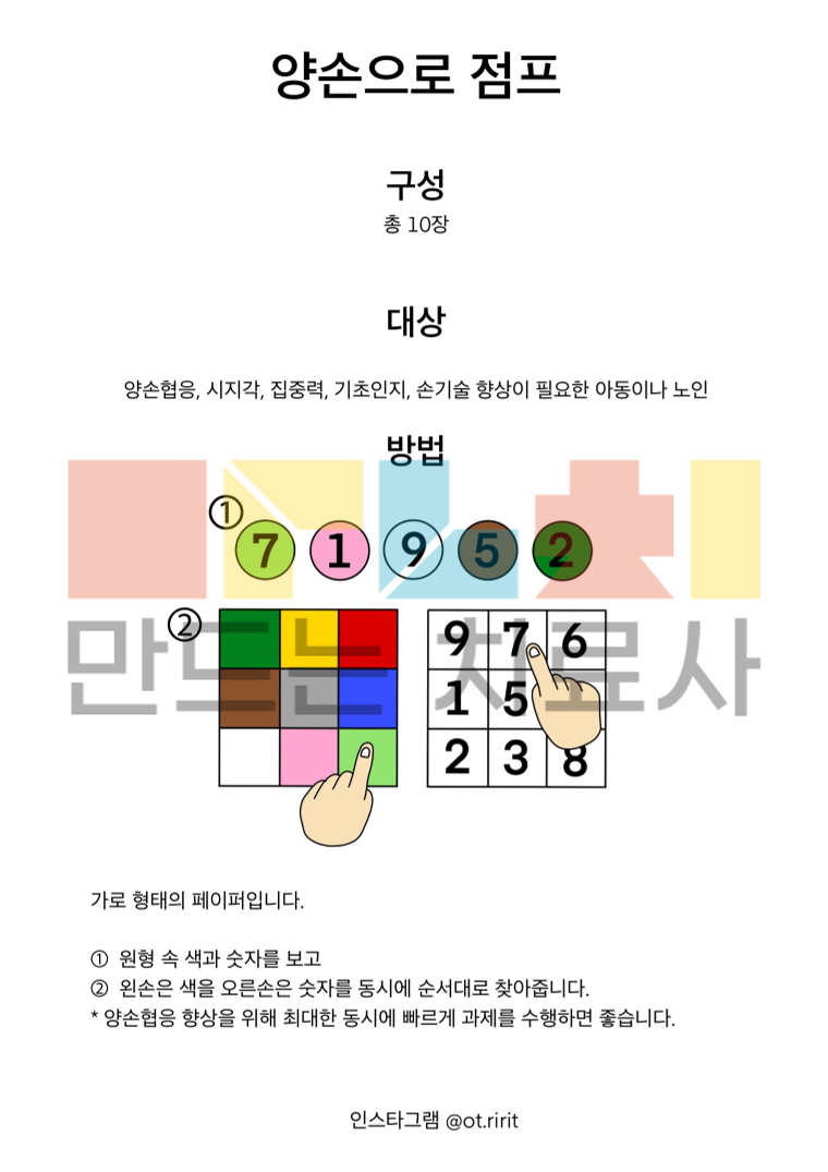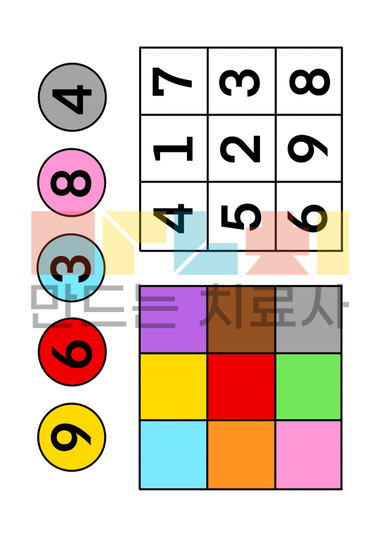 양손협응, 눈손협응을 위한 가로 형태의 페이퍼입니다. 제시된 원형 속 숫자와 색을 왼손, 오른손으로 동시에 찾으면 됩니다.