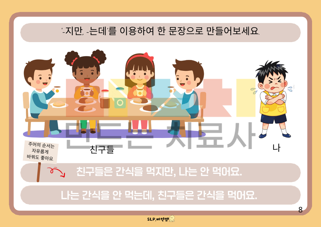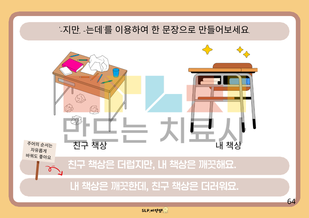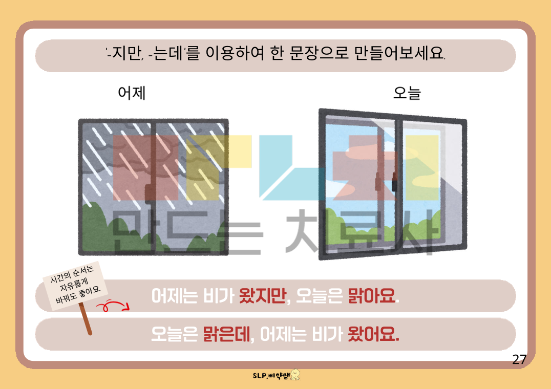 단문을 연결하는 연결어미 중 대등적으로 연결할 때 쓰이는 연결어미 입니다. 종속적 표현보다 쉬워서 어렵지 않게 접근할 수 있습니다. # 대상: -단문 위주로 사용하는 아동. -연결어미를 쓰지만, "-고"만 사용하는 아동. - 일상 대화에서 문장 사용이 매끄럽지 않아 내용 전달이 잘 안되는 아동. -읽고 쓰기가 되지 않아도, 그림을 보며 대화 형식으로 가능한 아동. #내용: 반대말 위주의 형용사 연결 ("00은 크지만, 00은 작아요, 00은 깨끗한데 00은 더러워요." 등) 동사 연결 ("00은 가는데, 00은 안 가요, 00은 먹지만, 00은 안 먹어요." 등) 시제표현이 포함된 연결("어제는 00 했지만, 오늘은 00해요, 지금은 00하는데, 나중에는 00할 거예요." 등) #사용 팁: -단계별로 쉬운 형용사 연결->동사 연결->시제 표현 포함 연결 과 같이 나누어서 진행. -읽고 쓰기 가능한 아동은 말도 해보고, 직접 쓰면서 다 감각을 활용하여 익히기. -읽고 쓰기가 안 되는 아동은 "1번 그림 단문 만들기+2번 그림 단문 만들기 => 2문장 연결해서 복문으로 연결하기" 과정을 통해 말하며 익히기.