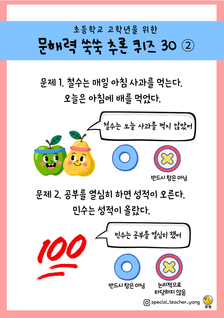 알쏭달쏭 추론 퀴즈를 풀어보며 문해력과 논리를 한번에 잡을 수 있습니다. 완벽하게 맞으면 o 맞을수도 아닐수도 있으면 x 입니다