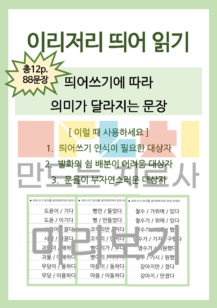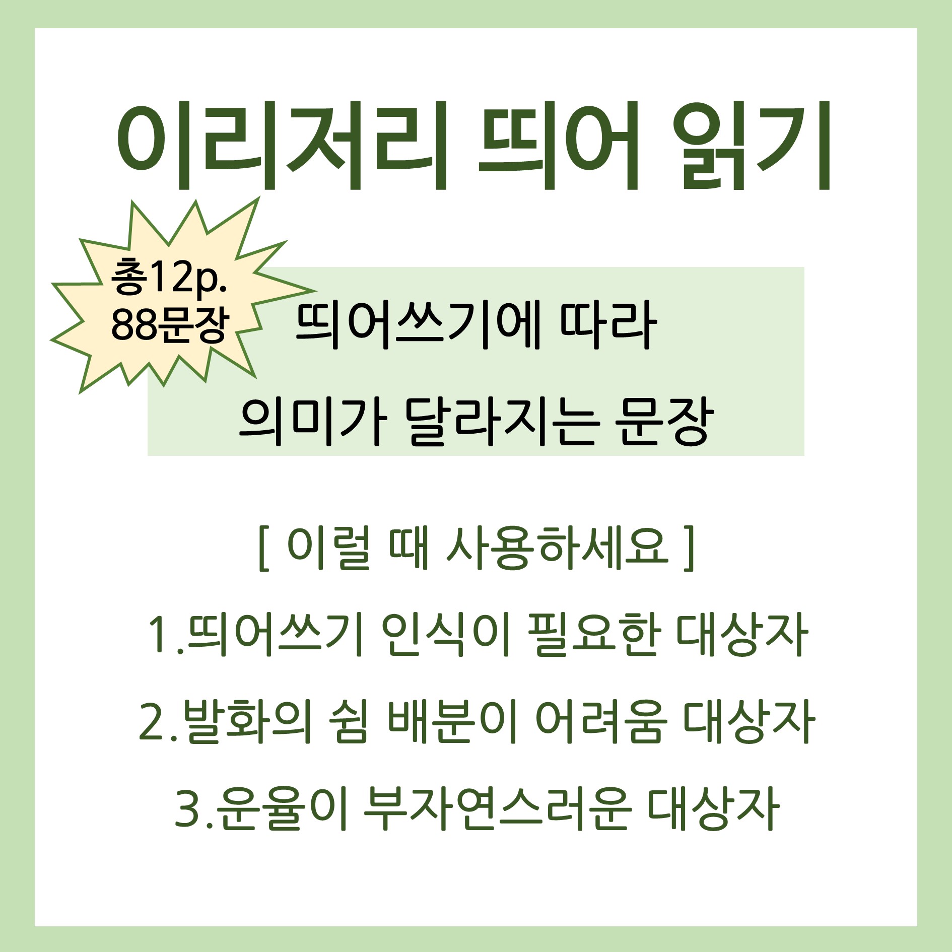 띄어쓰기에 따라 의미가 달라지는 문장 [ 이럴 때 사용하세요 ] 1.띄어쓰기 인식이 필요한 대상자 2.발화의 쉼 배분이 어려움 대상자 3.운율이 부자연스러운 대상자