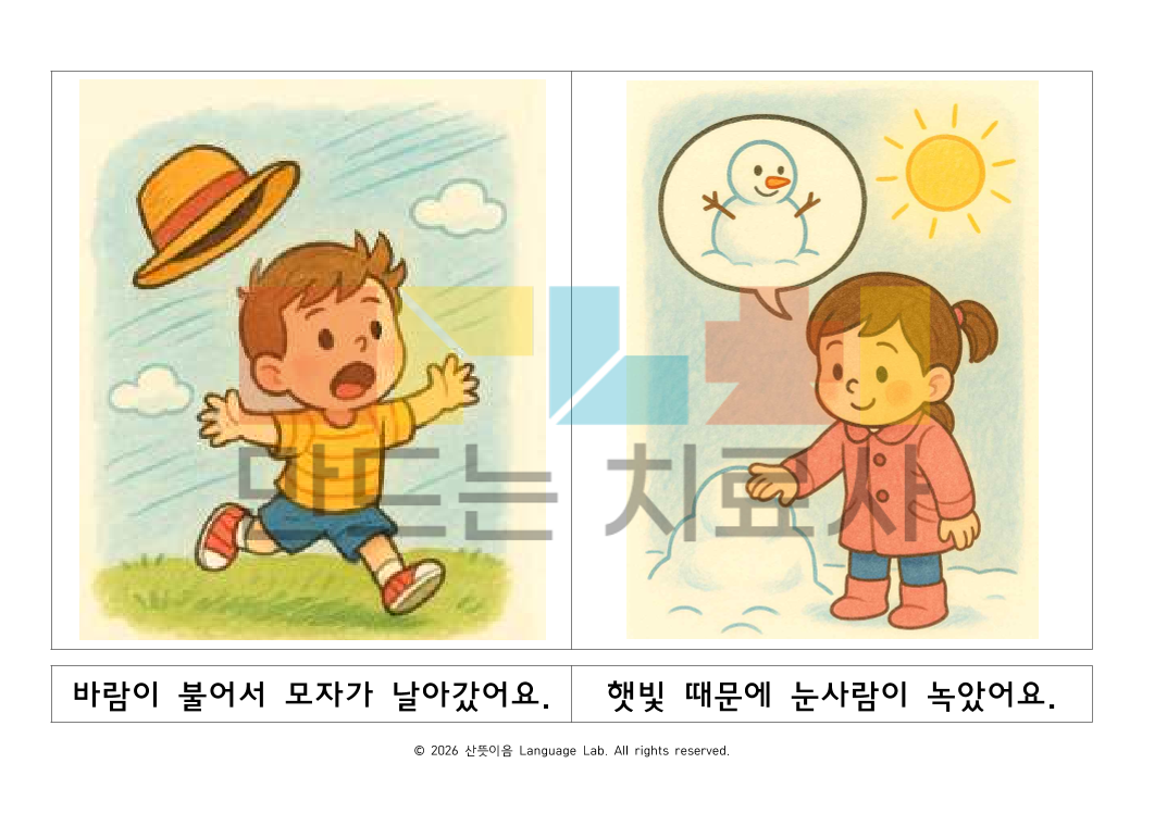 ■ 총 21개의 그림으로 구성되어, 한 현상만 설명하고 끝나는 것이 아니라 자연현상 안에서 다양한 상황을 반복적으로 연습할 수 있습니다. ■ 대상자 1. 원인–결과 이해가 어려운 아동의 자연현상 학습을 위한 시각자료 2. 일상적인 원인 질문에는 반응하지만, 새로운 상황에서는 이유 설명이 어려운 아동을 위한 그림 기반 추론 자료 3. 자연현상 이유 설명에서 반복적으로 막히는 아동 “복잡한 설명 없이, 그림만 보고도 이유를 말하게 만드는 자료” ☞ 그림 안에 추론을 도와주는 단서들이 포함되어 있어, 색깔펜 등으로 표시하며 지시적 단서를 제공하면 원인에 맞는 답을 자연스럽게 유도할 수 있습니다.