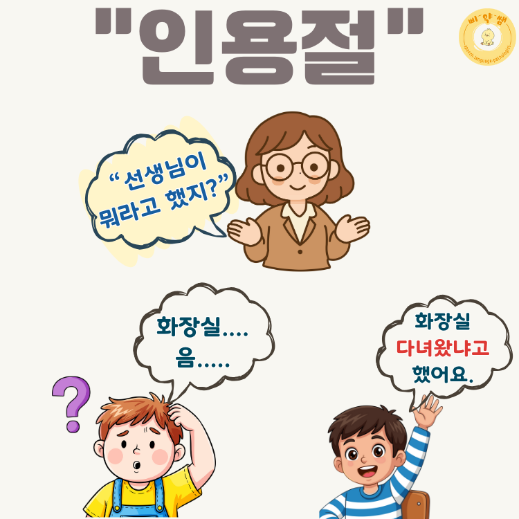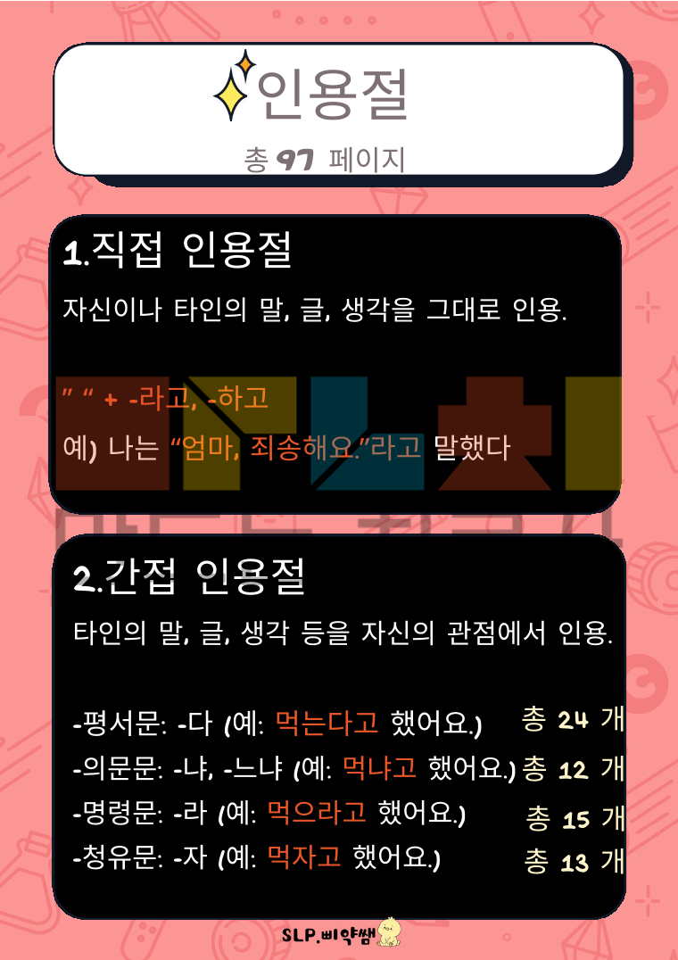 다른 사람이 한 이야기를 전달하는 방식에는 직접 인용과 간접 인용이 있지요. 직접 인용은[ "엄마가 밥 먹어."라고 했어.]와 같이 전달하면 되니 아이들이 비교적 잘 이야기 합니다. 반면, 간접 인용은 평서문, 의문문, 명령문, 청유문에 따락 '-다고, -냐고,-라고, -자고'와 같은 표현을 써서 활용해야 하므로 전달하기 어려워하는 아동들이 있습니다. SLP가 말 한 직후 "선생님이 뭐라고 했지?"라고 물어도 잘 대답하지 못하는 경우가 많습니다. (여기서는 주의집중 문제로 대답 못하는 아동들 대신 인용절 사용이 어려운 아동들을 예로 든 것입니다. 단, 주의 집중에 문제가 있는 아동들도 듣기 연습을 하면서 주의집중 및 인용절 사용을 훈련해도 좋습니다.) 글을 읽지 못하는 아동들은 SLP가 그림을 보여주며, 역할극처럼 대사를 읽어준 후 듣고 대답하는 형식으로 하면 더 재미있는 연습이 됩니다 ^^
