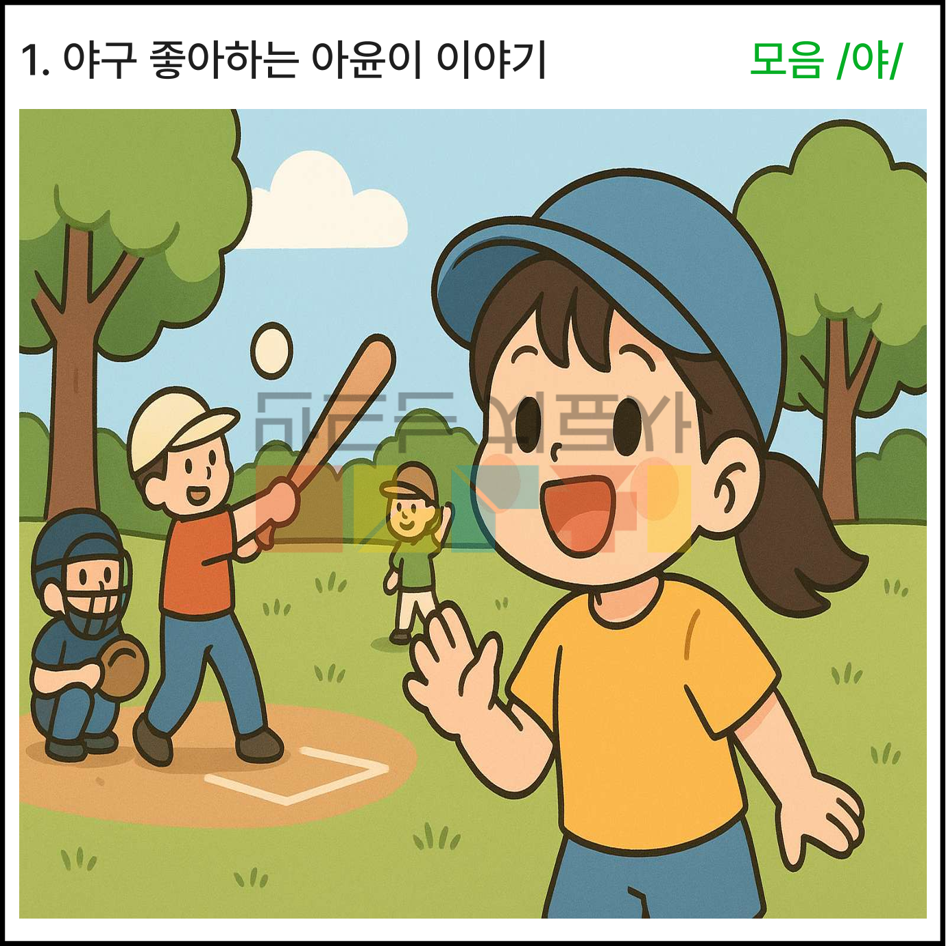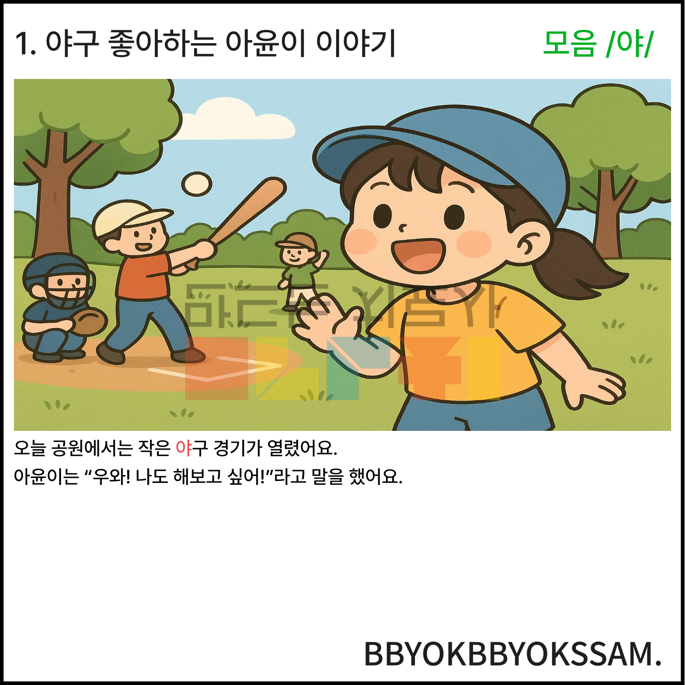모음 /야/와 관련한 상황이야기 5가지로 구성되어있습니다. 각 장면은 5컷 장면으로 구성되어있습니다. 빨간색으로 표시된 글씨가 목표 음소입니다