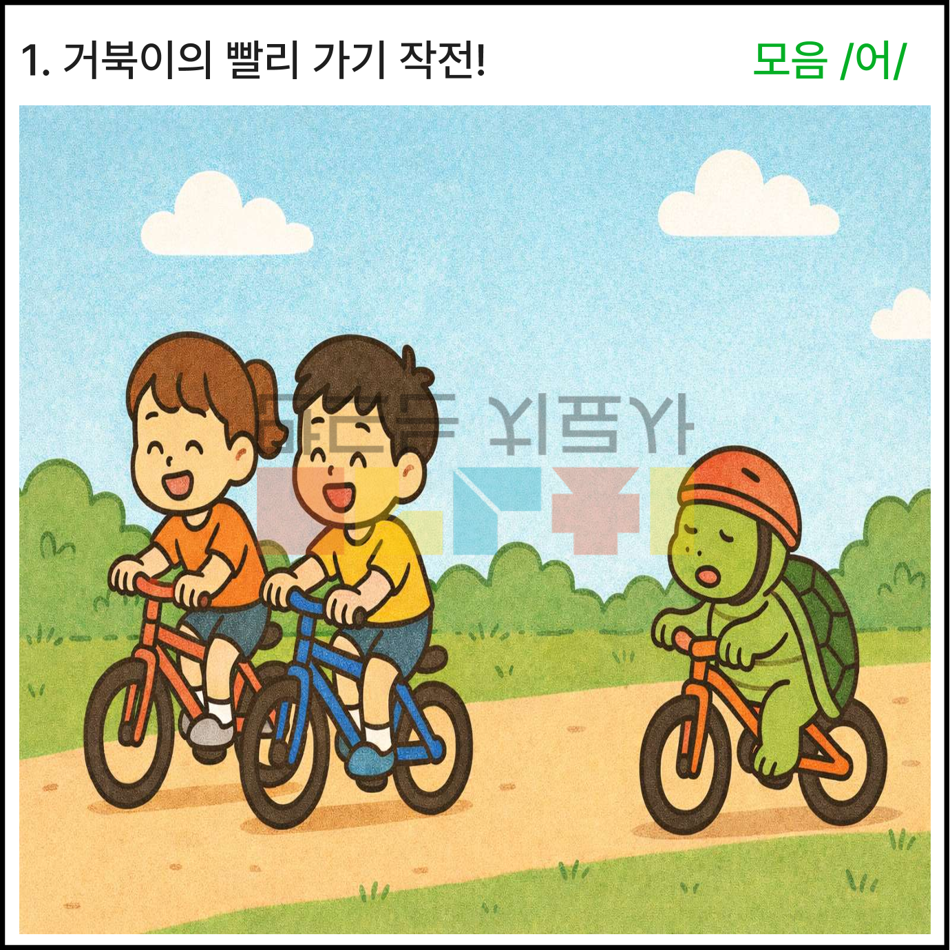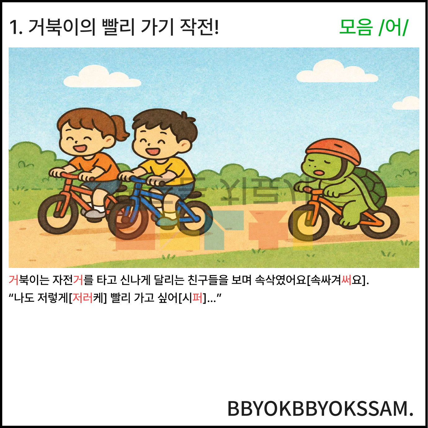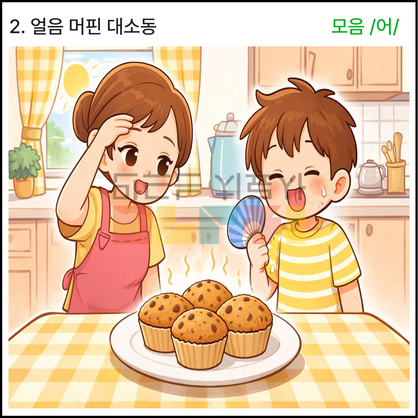 모음 /어/와 관련한 상황이야기 5가지로 구성되어있습니다. 각 장면은 5컷 장면으로 구성되어있습니다. 빨간색으로 표시된 글씨가 목표 음소입니다.