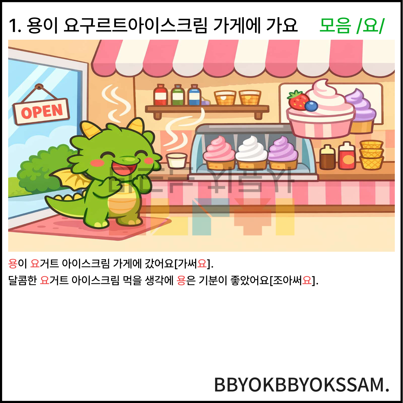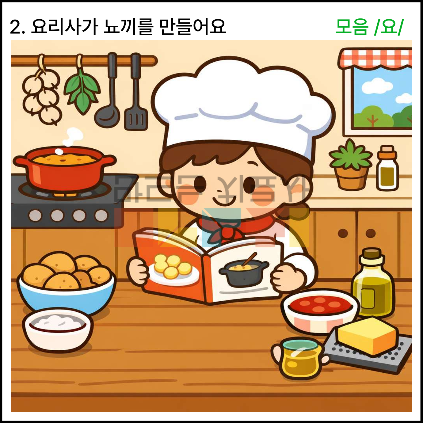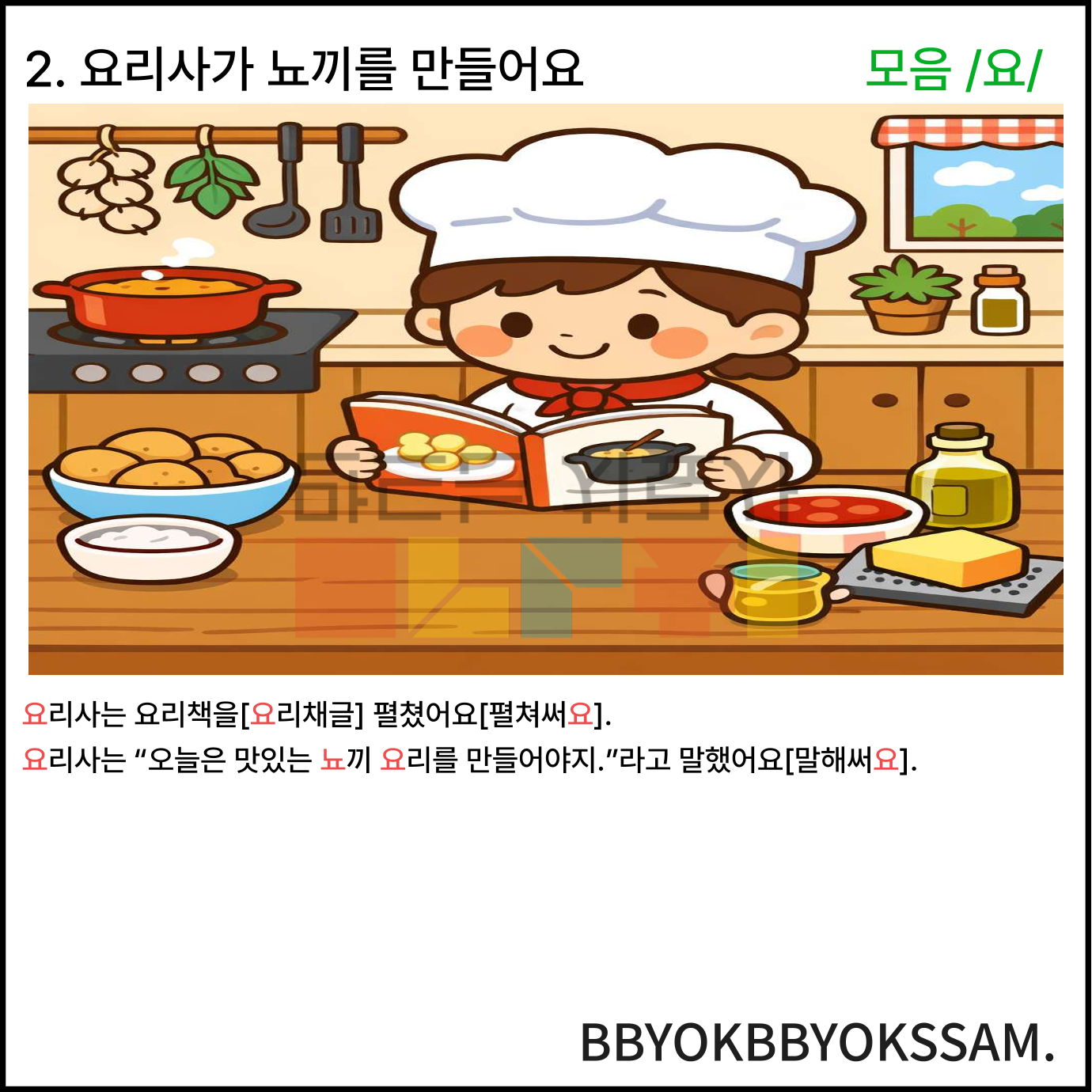 모음 /요/와 관련한 상황이야기 5가지로 구성되어있습니다. 각 장면은 5-6컷 장면으로 구성되어있습니다. 빨간색으로 표시된 글씨가 목표 음소입니다.