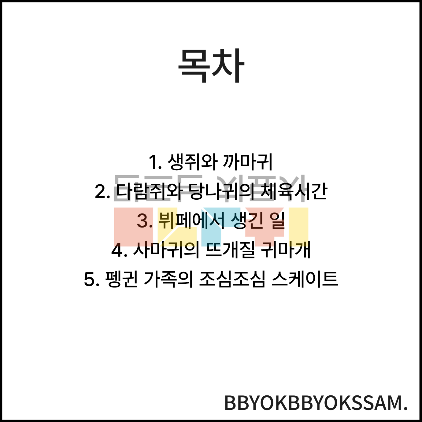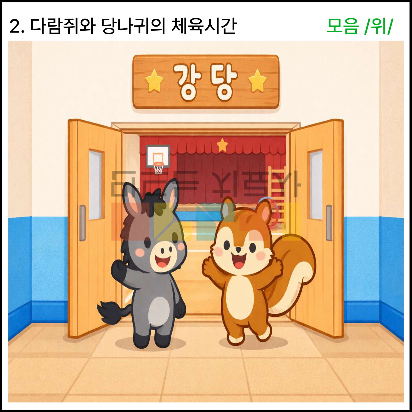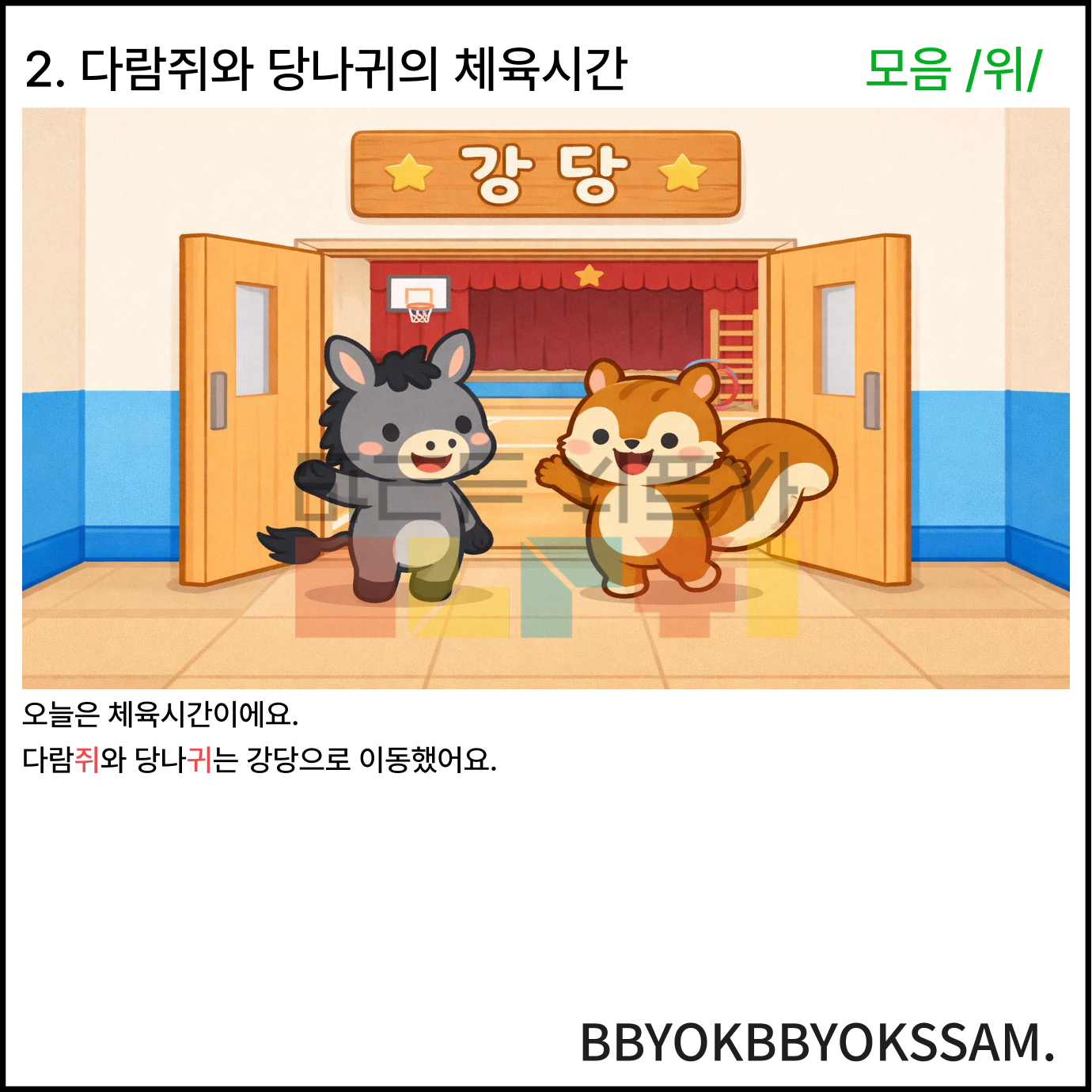모음 /위/와 관련한 상황이야기 5가지로 구성되어있습니다. 각 장면은 5-6컷 장면으로 구성되어있습니다. 빨간색으로 표시된 글씨가 목표 음소입니다.