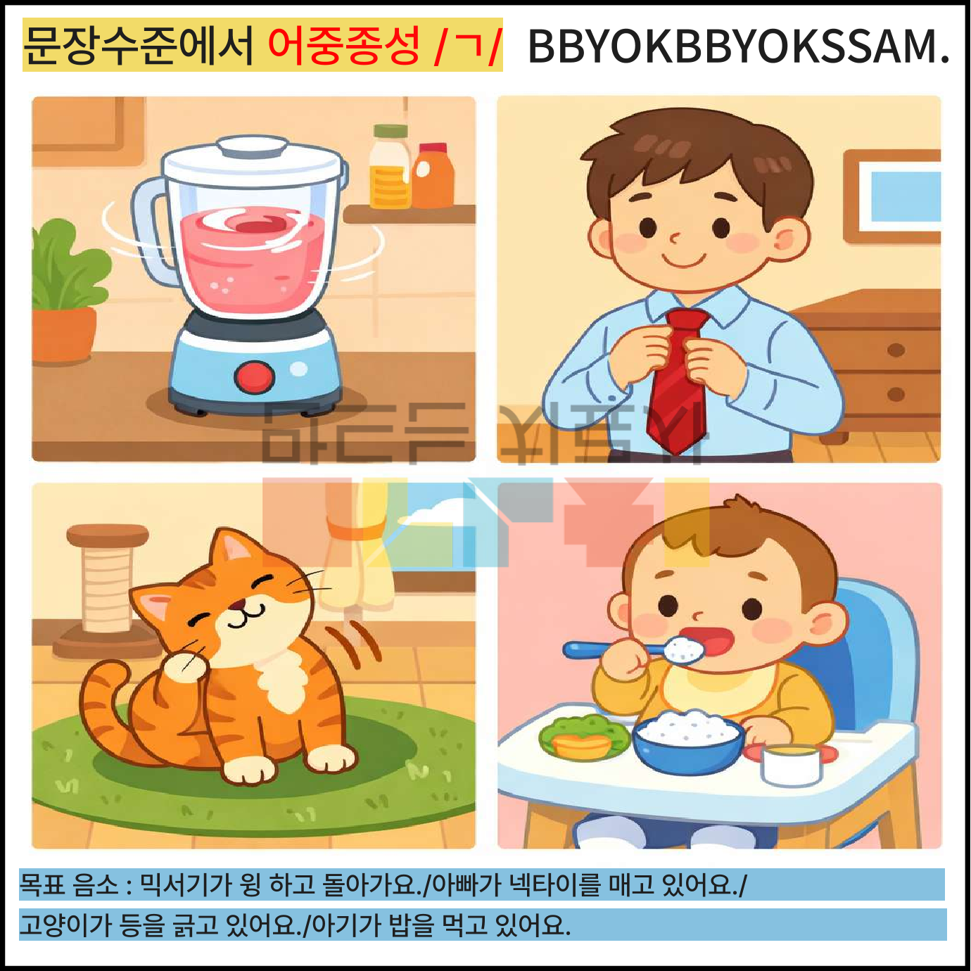 문장 수준에서 어중종성과 어말종성 /ㄱ/으로 1페이지에 3-4장면의 문장을 연습하는 것으로 구성하였습니다. 어중종성과 어말종성은 각 10페이지로 구성되어 있습니다.