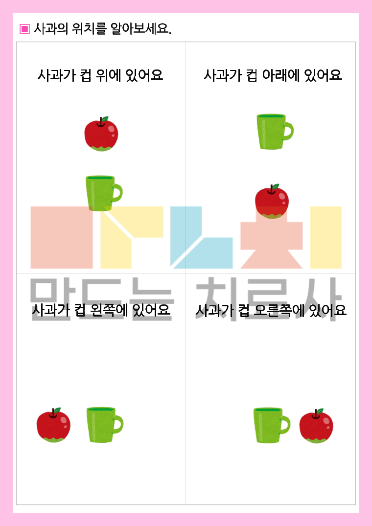 들려주는 지시대로 그림 그리기 방향 및 위치, 모양이 포함된 지시 수행 활동지 입니다. [목차] 총 19p -모양 알기 2p -위치, 방향 알기 3p -지시 듣고 그림 그리기 12p