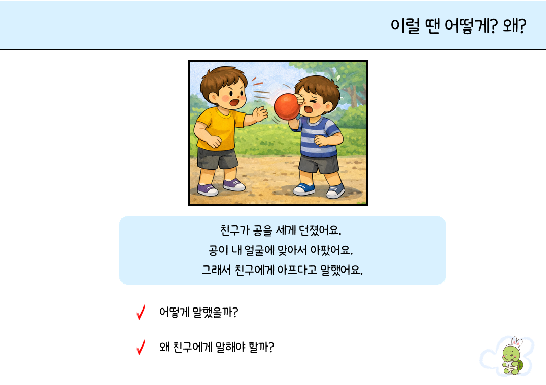 아이들이 일상생활(유치원, 놀이터, 가정 등)에서 흔히 겪는 갈등 상황을 상황그림으로 담아낸 상황 추론 및 사회성 기술 훈련 자료입니다. 단순히 상황을 설명하는 것에 그치지 않고, 타인의 감정을 이해하고 적절한 해결책을 말로 표현하는 힘을 길러줍니다. 1. 대상 -만 4세 ~ 초등 저학년: 일상적인 사회적 규칙을 배우고 실천해야 하는 시기의 아동 -상황에 맞는 적절한 화용 언어(사회적 의사소통) 사용이 어려운 아동 -사건의 **원인과 결과를 파악(인과관계 추론)**하는 데 어려움을 겪는 아동 2. 자료 구성 및 특징 "어떻게 했을까?": 상황에 맞는 적절한 말하기와 대처 행동 유도 "왜 그랬을까?": 상황의 원인 파악 및 사회적 규칙의 필요성(도덕성/공감) 인지 3. 학습 목표 상황 추론 및 인과관계 이해: "왜 이런 일이 일어났을까?"에 대해 논리적으로 설명할 수 있습니다. 화용적 언어 기술 습득: 갈등 상황에서 상대방의 기분을 상하지 않게 하면서 자신의 의사를 전달하는 법을 배웁니다. 문제 해결 전략 수립: 예상치 못한 문제가 생겼을 때 스스로 대안을 찾는 연습을 합니다. 4. 활용 팁! 역할극: 그림 속 대화를 아이와 치료사가 직접 주고받으며 연습해 보세요. 확장 활동: "만약 ~라면 어떻게 될까?"라는 질문을 통해 그림 너머의 상황을 상상하며 사고력을 넓힐 수 있습니다.