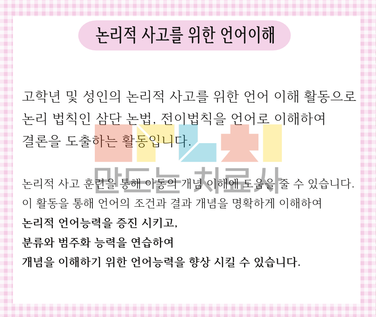 논리적 사고 훈련으로 아동의 개념이해를 도와줄 수 있습니다. 이 활동으로 언어의 조건과 개념을 명확하게 이해하여 논리적 언어능력을 증진 시키고, 분류와 범주화 능력을 연습하여 개념을 이해하기 위한 언어능력을 향상 시킬 수 있습니다.