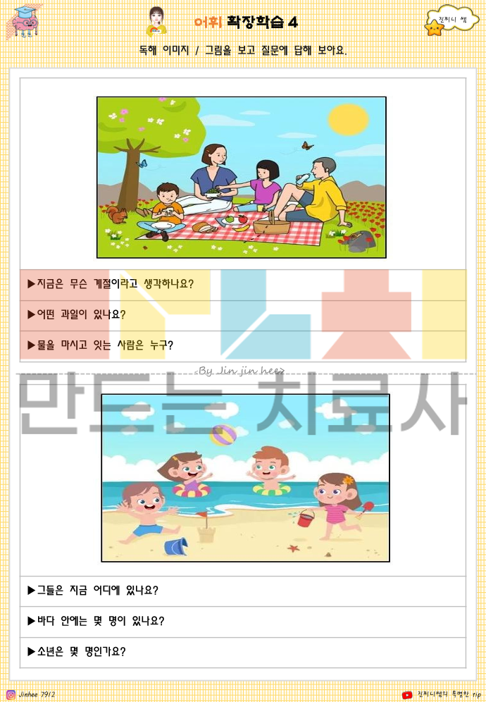 📘 이 책으로 알 수 있는 것은 -어휘 이해 수준: 사물·상황의 의미를 정확히 알고 있는지 -문장 이해력: 질문을 듣고 문장의 핵심을 파악하는지 -추론 능력: 글이나 그림의 단서를 바탕으로 이유·결과를 생각할 수 있는지 -범주화 능력: 사물·개념을 공통점으로 묶어 이해하는지 -감정 이해: 상황에 따른 인물의 감정과 마음 변화를 파악하는지 -사고의 흐름: ‘상황 → 생각 → 감정 → 행동’을 연결해 이해하는지 -생활 적용력: 배운 어휘와 개념을 일상 장면에 연결할 수 있는지 👉 한 줄로 정리하면 이 책은 아이가 말을 ‘아는지’가 아니라, 이해하고 생각해서 말할 수 있는지를 보여주는 인지·언어 기초 자료입니다.^^
