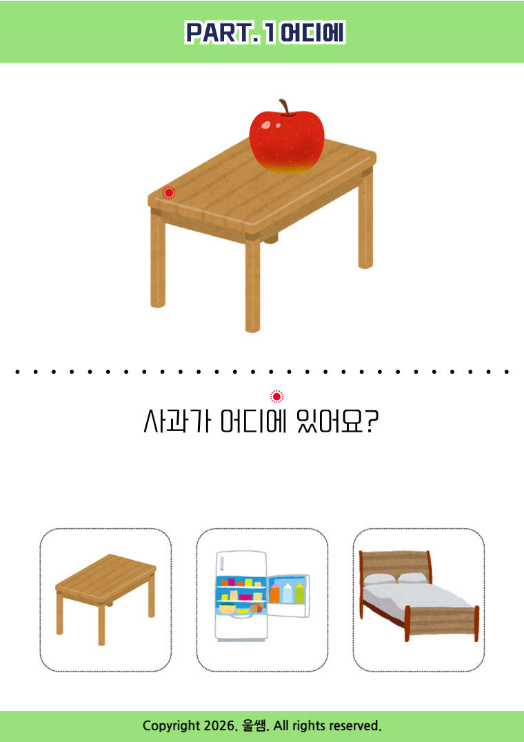 🎯 활동대상 - 조사사용이 미숙하거나 문장확장이 필요한 아이 - 시각적 단서를 통해 상황을 이해하고자 하는 아이 - 직관적인 그림과 선택지를 통해 성공경험을 쌓고 싶은 아이 ⭐️ Part. 1 '어디에' 자료는? 사물이 놓여 있는 고정된 위치를 파악하고 장소명사를 익히는 단계입니다 👀 시각적 단서효과 정답 위치에 빨간 점을 배치하여, 아이의 시선이 머물러야 할 곳을 직관적으로 인지할 수 있도록 하며 "어디에 있지?"라는 질문에 명확한 지점을 찾도록 유도합니다