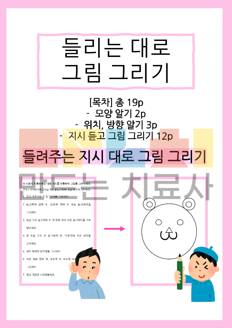 들려주는 지시대로 그림 그리기 방향 및 위치, 모양이 포함된 지시 수행 활동지 입니다. [목차] 총 19p -모양 알기 2p -위치, 방향 알기 3p -지시 듣고 그림 그리기 12p