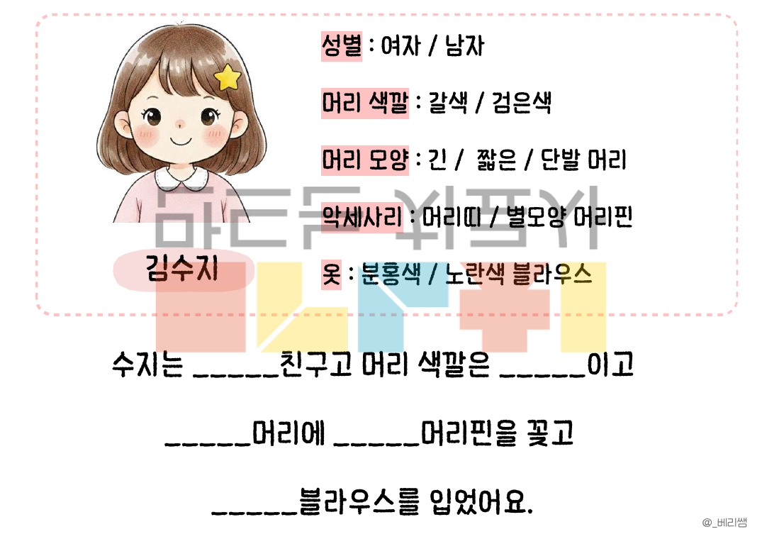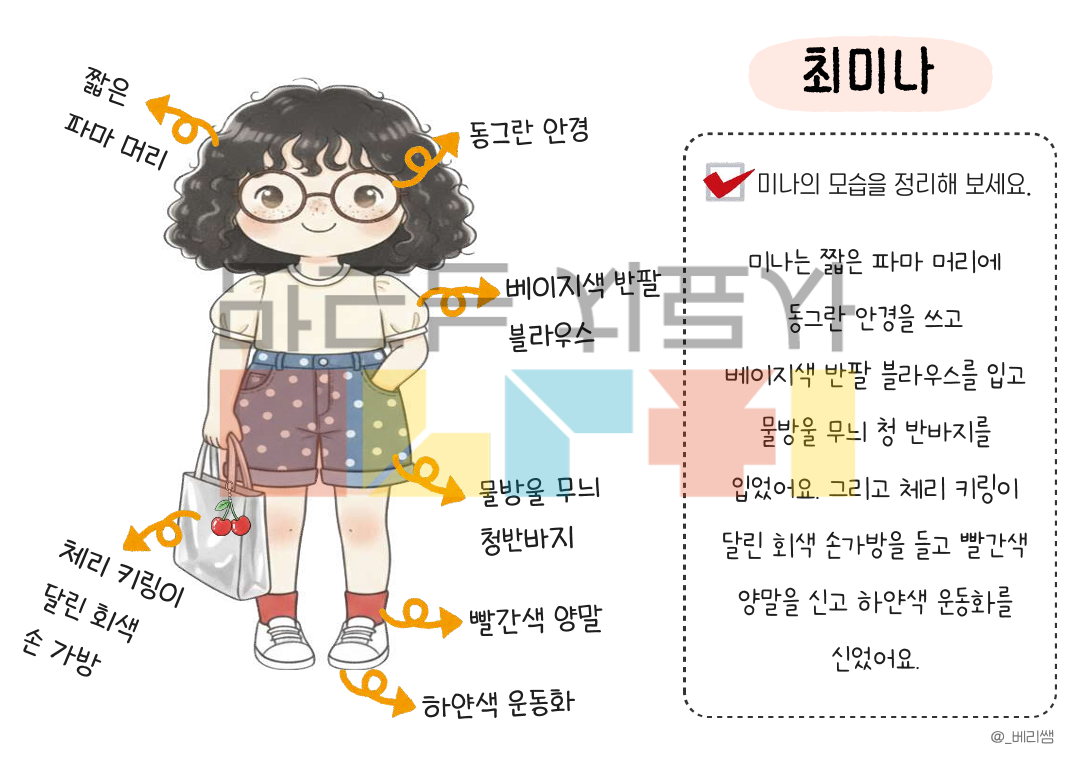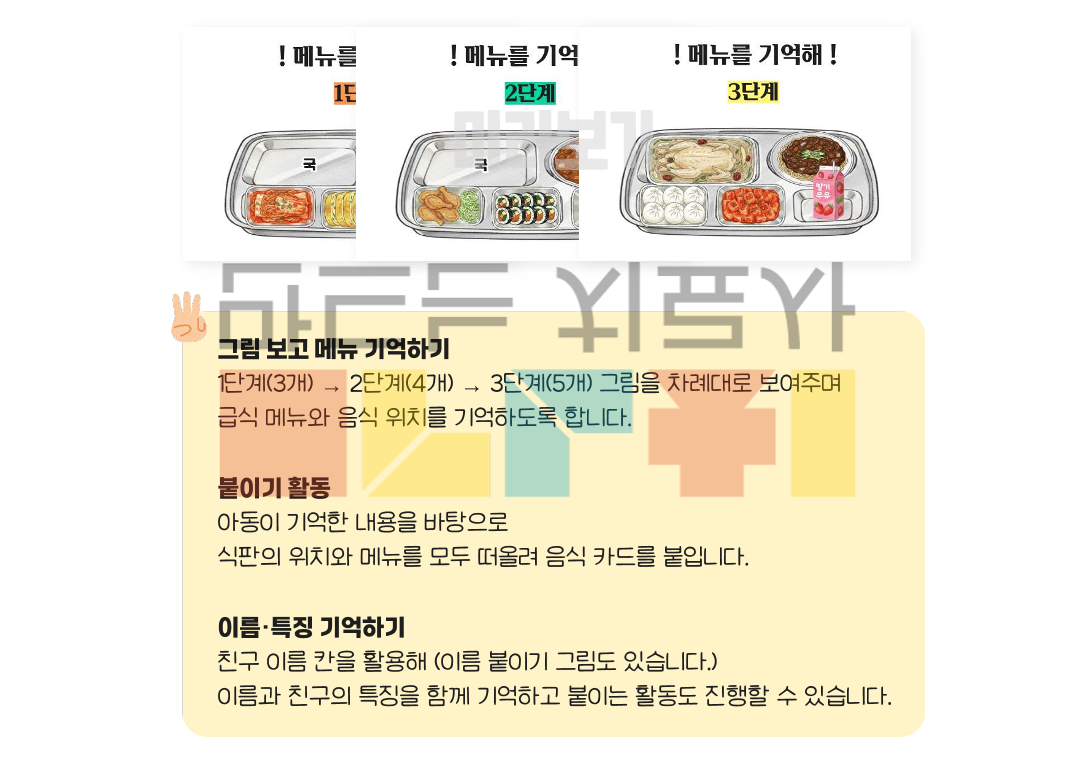 🧠 인지·언어 통합 활동 자료 안내 본 자료는 주의력 및 작업기억 기능이 미숙한 학령기 아동을 대상으로, 시각·청각 정보를 통합적으로 처리하고 기억하는 능력을 기르기 위해 제작된 인지·언어 통합 활동 자료입니다. 아동은 친구의 얼굴, 생김새, 옷차림과 같은 시각적 단서를 기억하고 이를 이름과 연결하여 회상하는 과정을 통해 인물 변별 능력과 시각·청각 주의력을 훈련합니다. 또한 급식 식판 메뉴 기억하기 활동을 통해 메뉴 구성과 음식의 위치를 단계적으로 기억하고 재구성하며 작업기억, 시각 기억, 순서 기억 능력을 강화합니다. 이 과정에서 인물 및 음식 관련 어휘를 활용해 설명하며 설명하기 능력, 어휘 확장, 의미 조직화 능력을 함께 증진할 수 있습니다. 🔹 기대 효과 청각·시각 주의력 증진 작업기억 및 시각 기억력 향상 인물 특징과 이름 연결 기억 능력 강화 메뉴·위치 기억을 통한 순서 기억 능력 향상 설명하기 능력 및 관련 어휘 확장 🔹 추천 대상 주의력이 쉽게 분산되는 학령기 아동 작업기억·시각·청각 기억이 미숙한 아동 인물 구분 및 이름 기억에 어려움이 있는 아동 설명하기 및 어휘 표현이 제한적인 아동