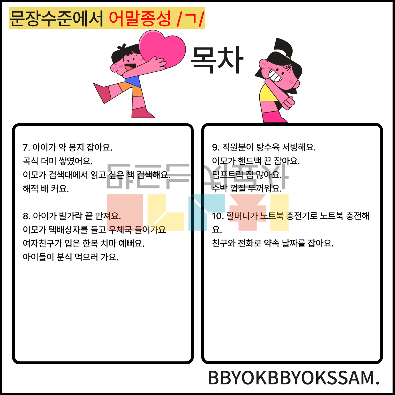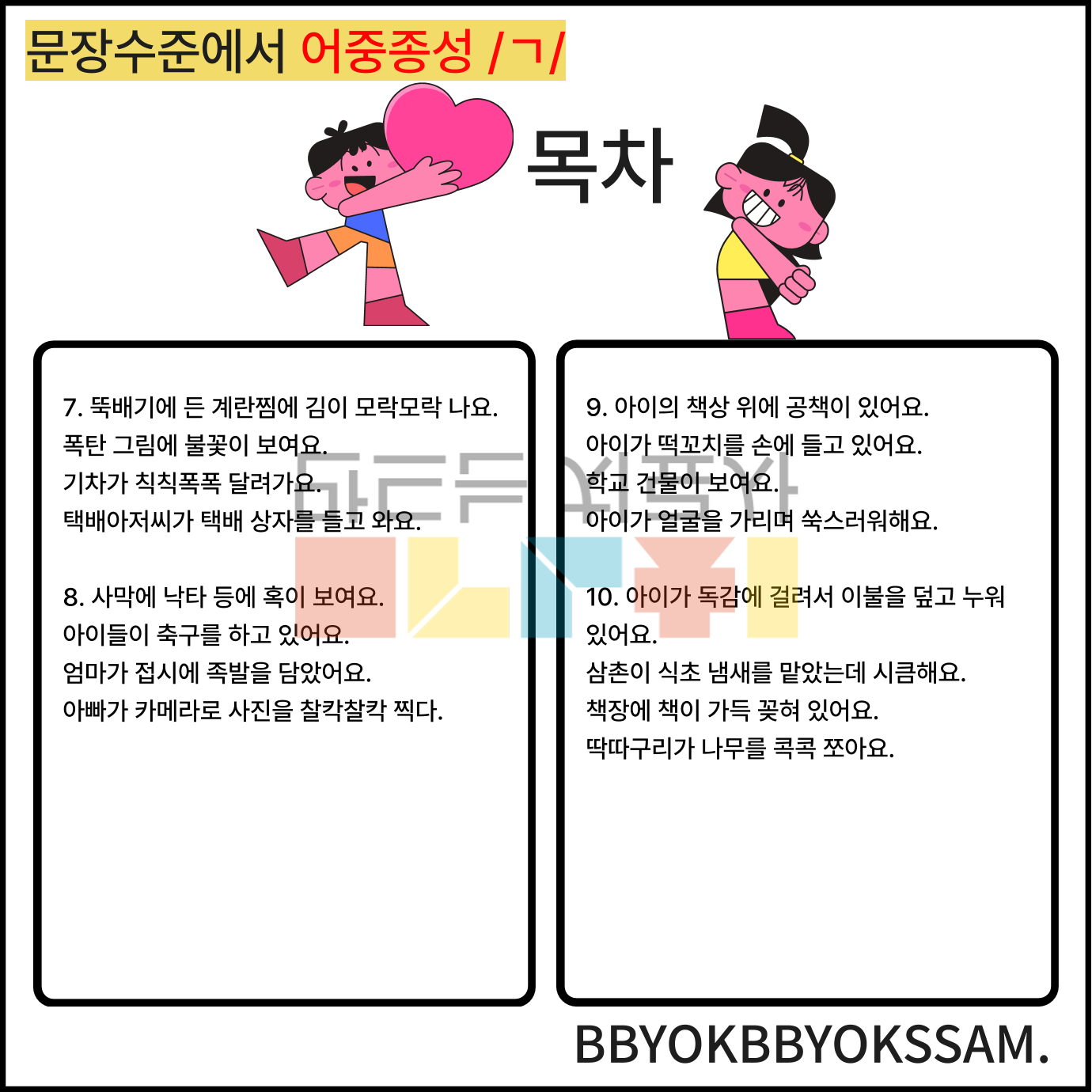 문장 수준에서 어중종성과 어말종성 /ㄱ/으로 1페이지에 3-4장면의 문장을 연습하는 것으로 구성하였습니다. 어중종성과 어말종성은 각 10페이지로 구성되어 있습니다.
