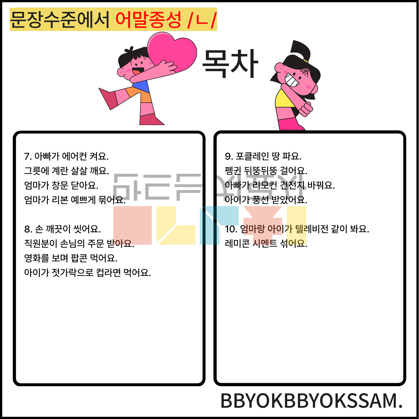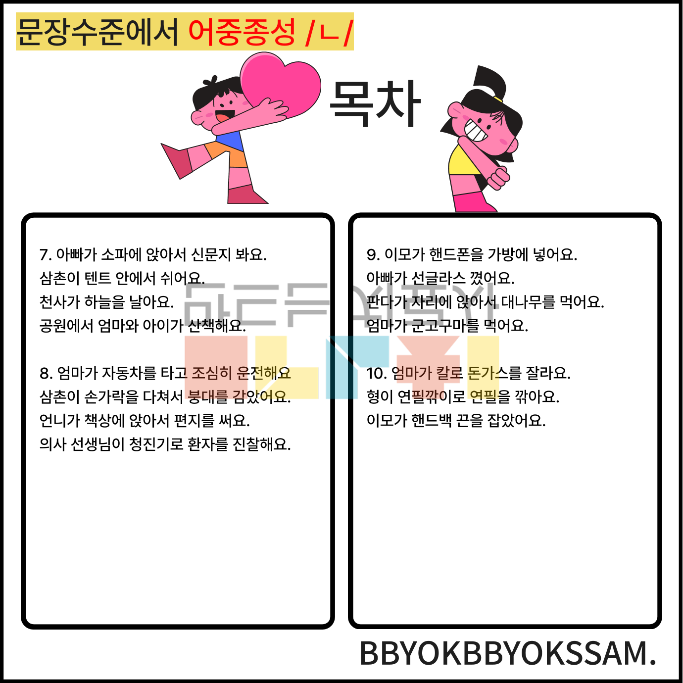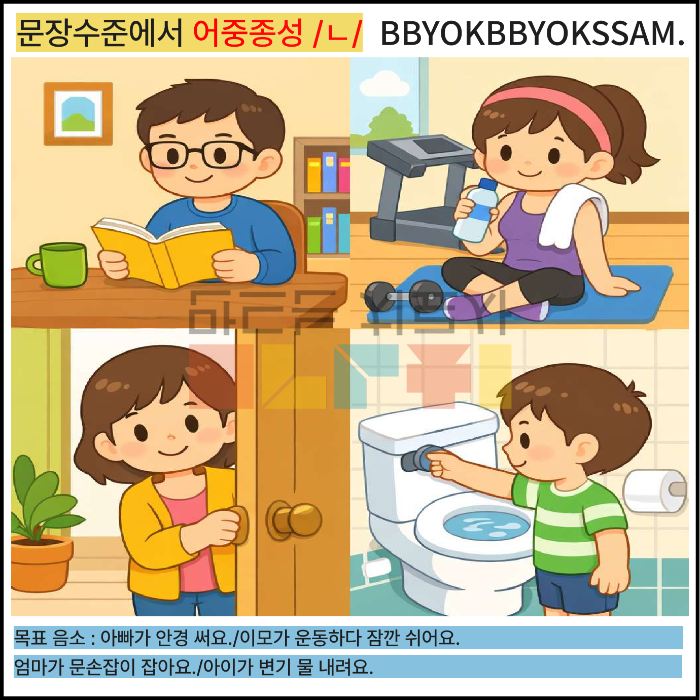문장 수준에서 어중종성과 어말종성 /ㄴ/으로 1페이지에 2-4장면의 문장을 연습하는 것으로 구성하였습니다. 어중종성과 어말종성은 각 10페이지로 구성되어 있습니다.