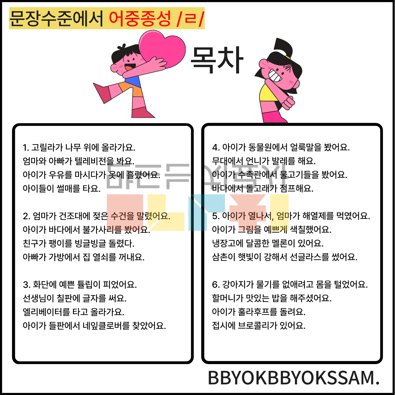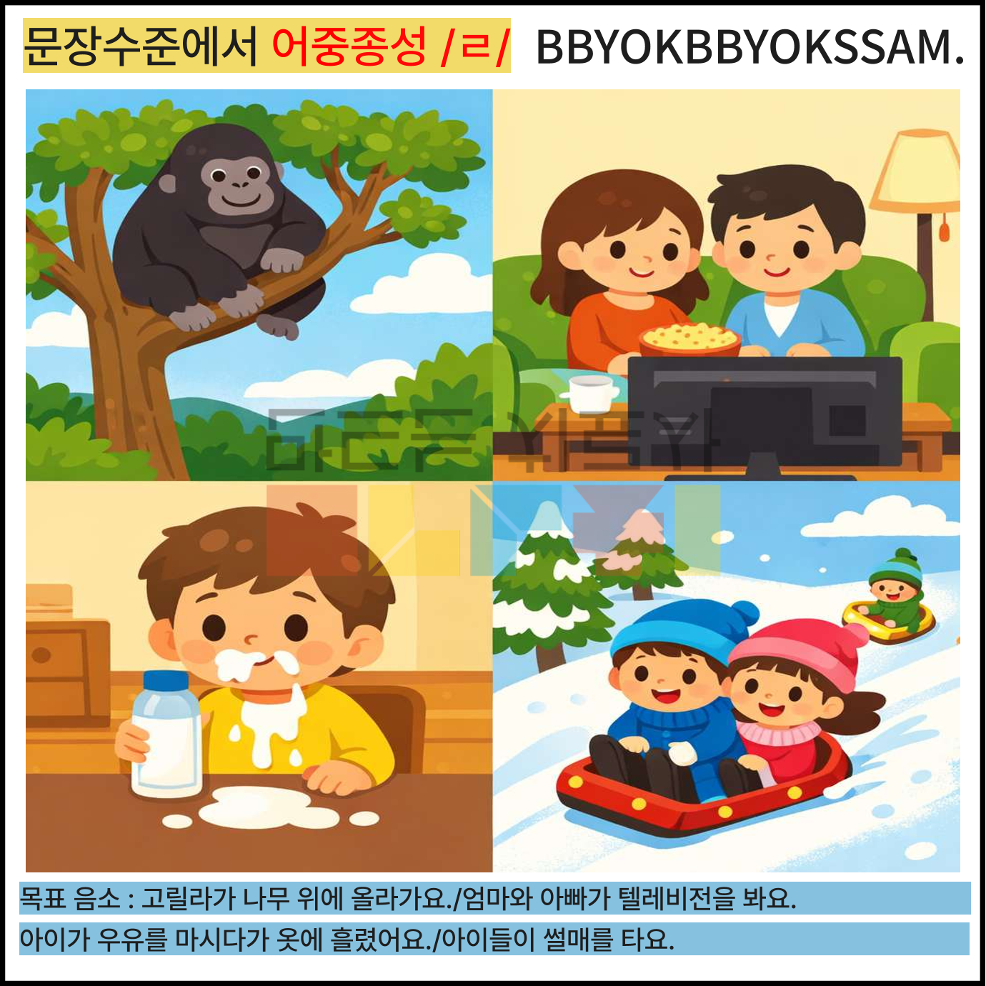 문장 수준에서 어중종성과 어말종성 /ㄹ/으로 1페이지에 4장면의 문장을 연습하는 것으로 구성하였습니다. 어중종성과 어말종성은 각 10페이지로 구성되어 있습니다.