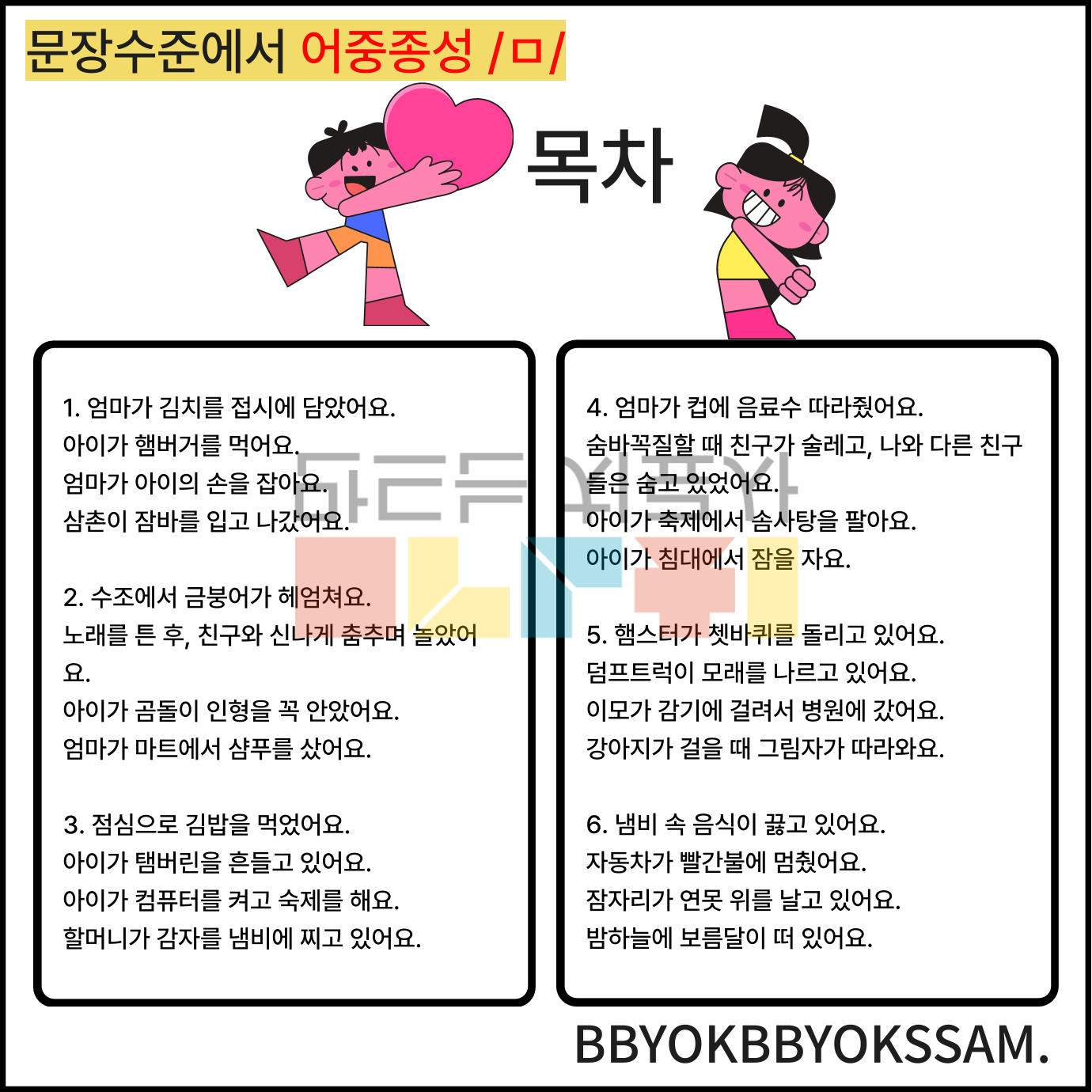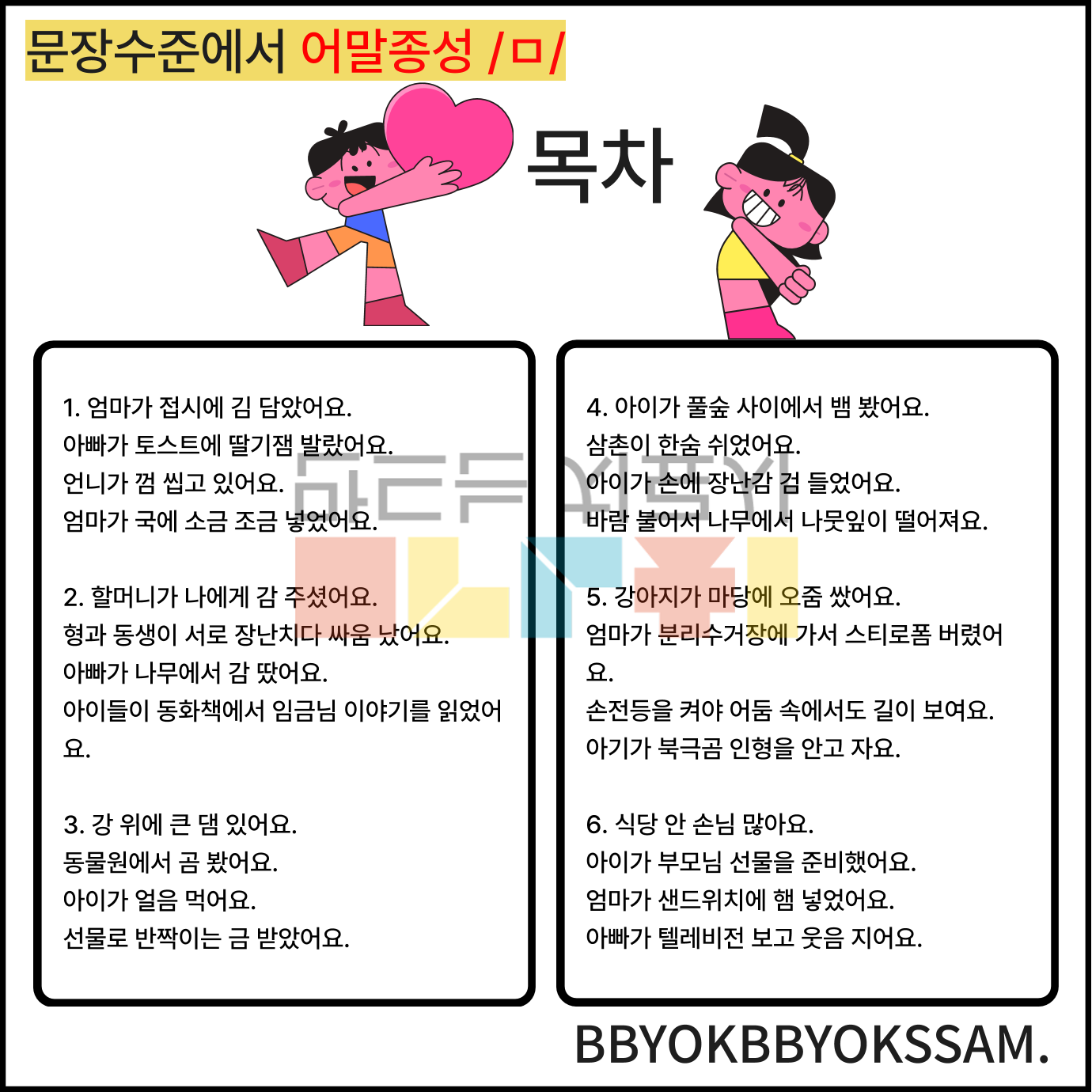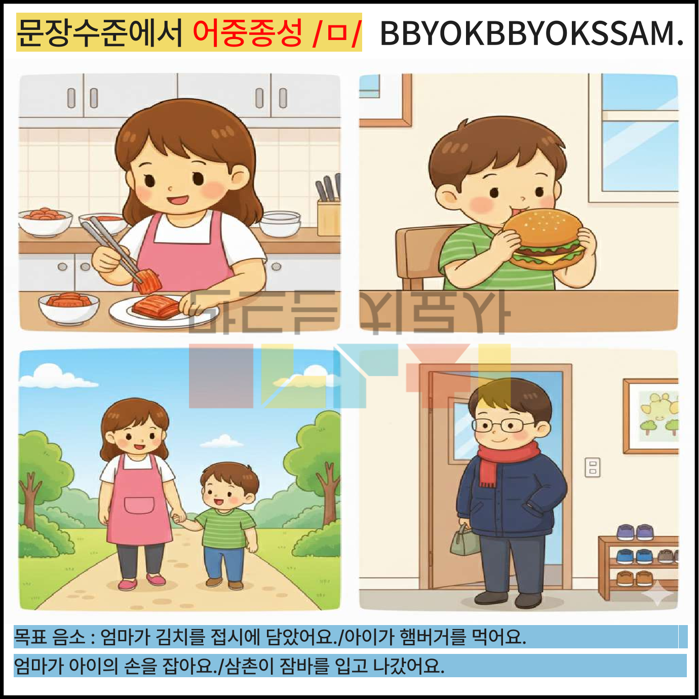 문장 수준에서 어중종성과 어말종성 /ㄹ/으로 1페이지에 2-4장면의 문장을 연습하는 것으로 구성하였습니다. 어중종성과 어말종성은 각 10페이지로 구성되어 있습니다.