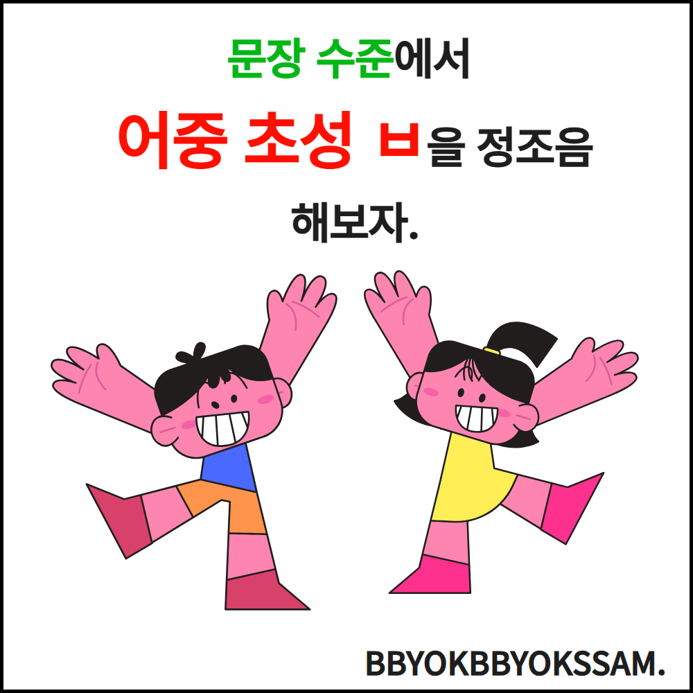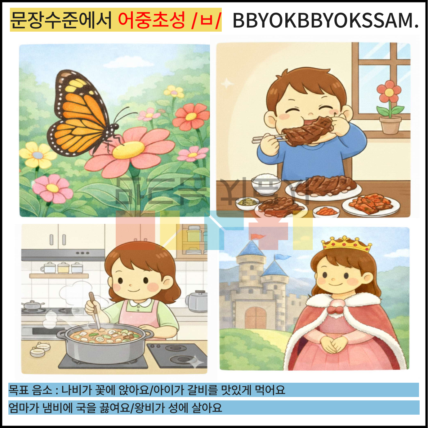 문장 수준에서 어중초성 /ㅂ/으로 1페이지에 3-4장면의 문장을 연습하는 것으로 구성하였습니다. 어중초성 13페이지로 구성되어 있습니다.