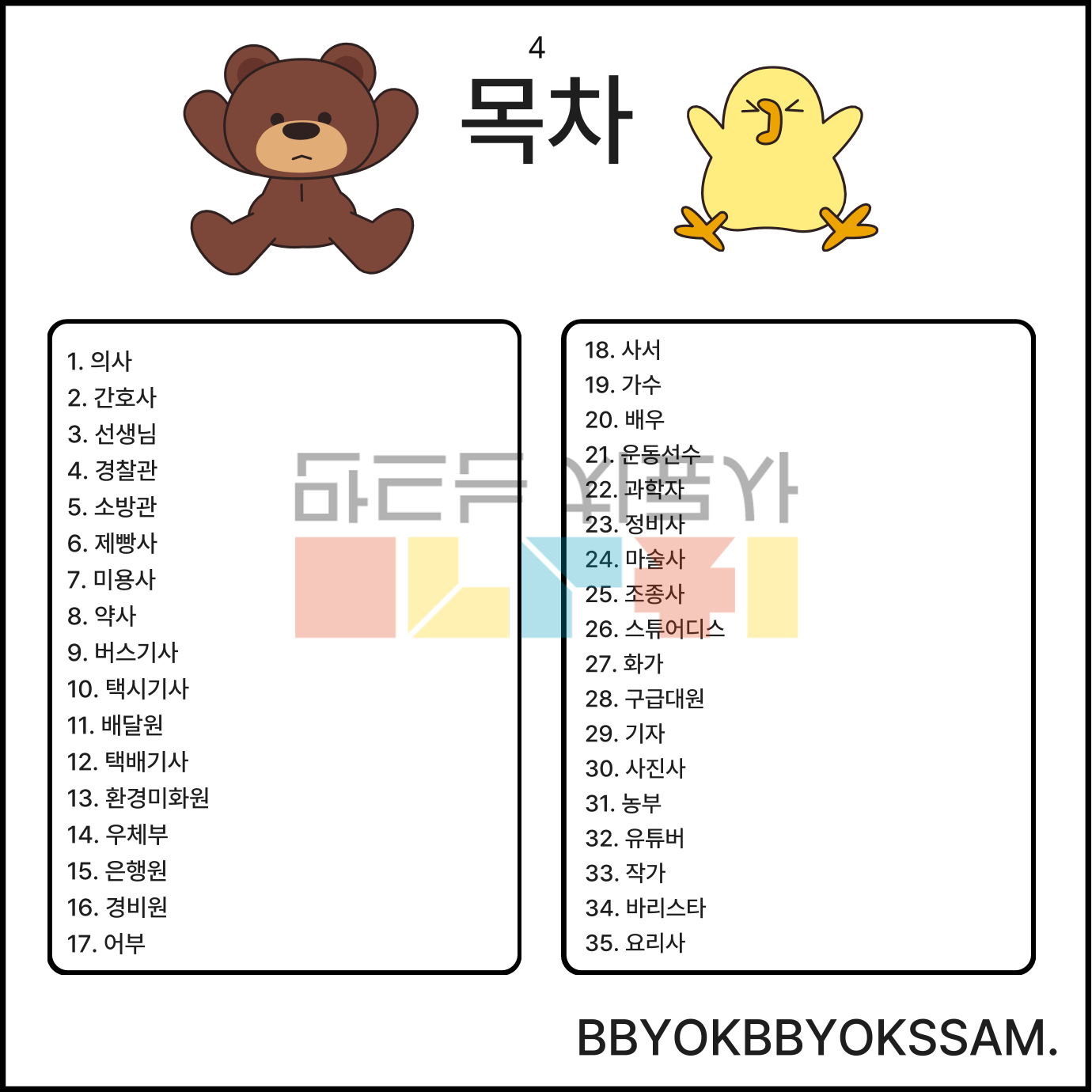 의문사 누구 질문에 대답하기, 직업 35가지, 직업 어휘를 활용하여 구문으로 설명하기 증진을 목표로 제작하였습니다.