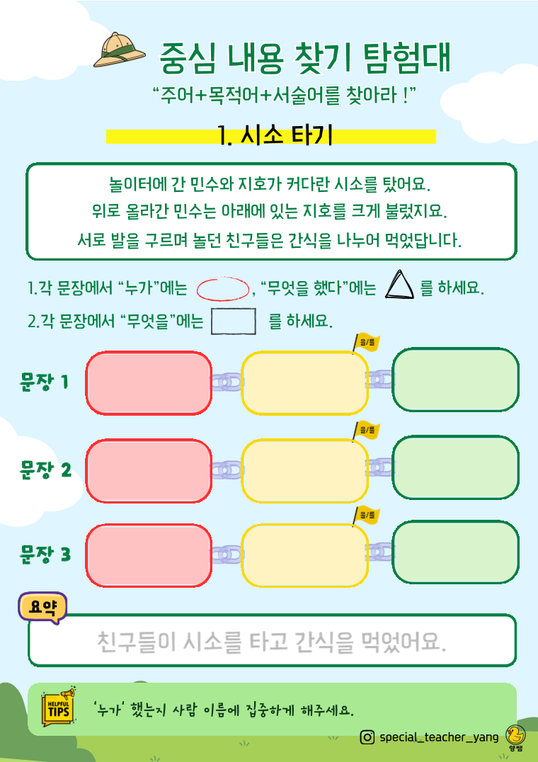★초등학교 저학년(1~2학년 수준)의 세 문장으로 이루어진 글을 읽고 주어와 목적어, 서술어를 찾아 내용을 파악하는 활동지입니다. ★50개의 지문으로 구성되어 있습니다.