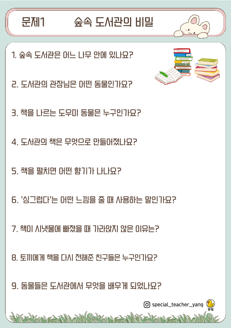 상품 형태 : PDF 파일 (구매 후 다운로드) 제작 : 양쌤 총 페이지 수 : 71 ★ 초등 저학년을 위한 이야기 글 독해 워크북입니다. ★ 초등 1학년 2학기~2학년 수준의 글로 구성되어 있습니다. ★ 지문 35개와 각 지문에 대한 9개의 문제로 이루어져 있습니다. ★ 문제 9개의 문제 유형은 단답형 혹은 서술형 문제입니다. ★ 다채로운 지문과 내용 이해, 어휘, 추론 등 다양한 분야의 문제를 만나보세요!