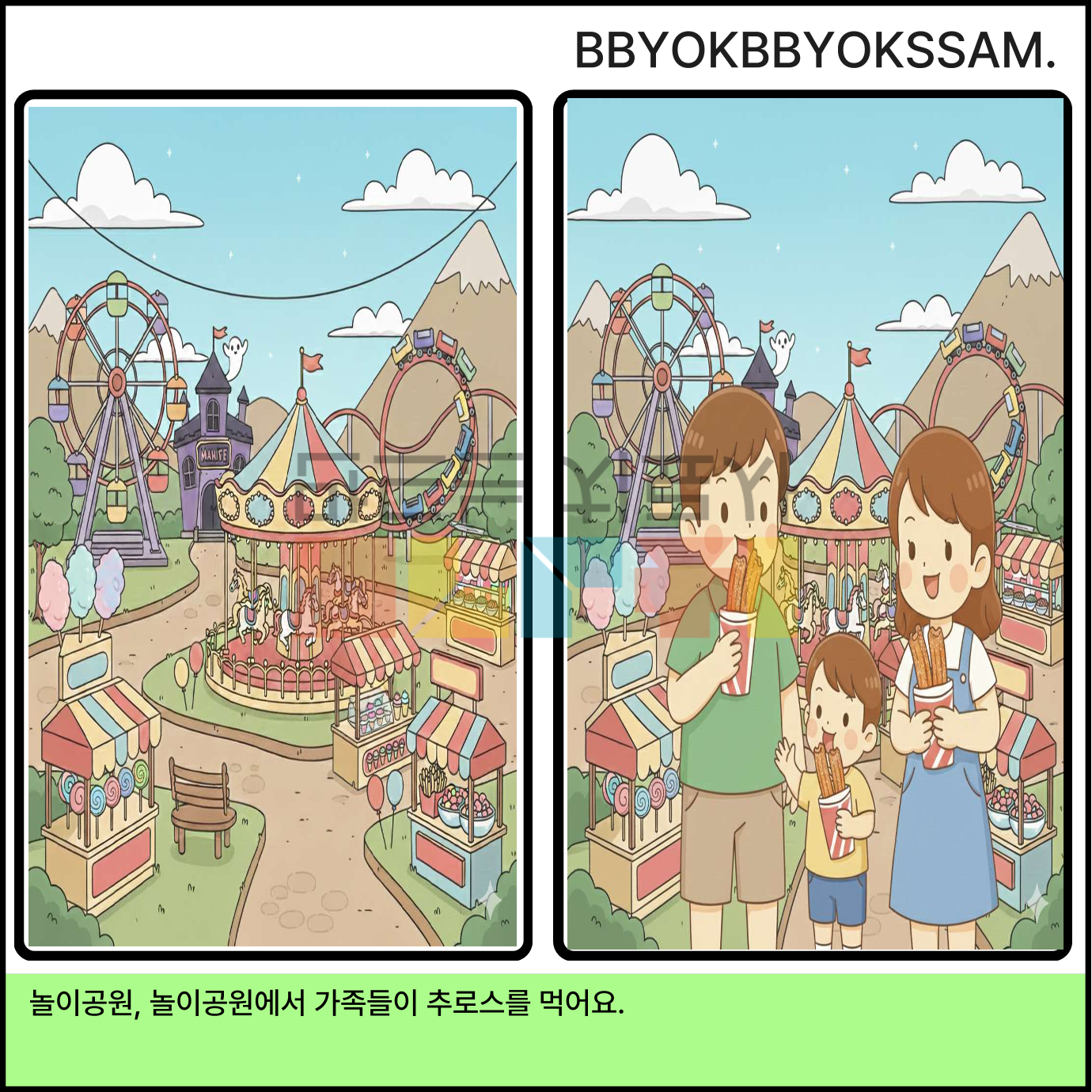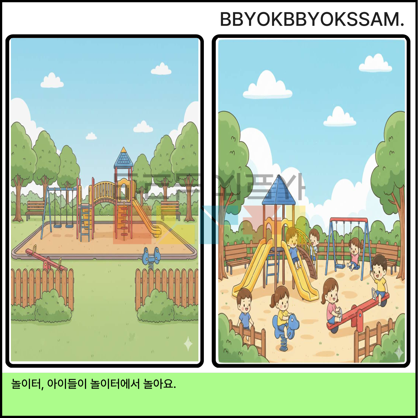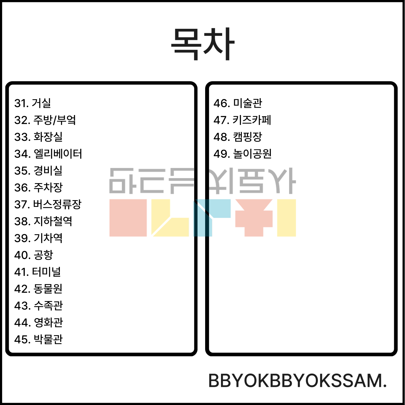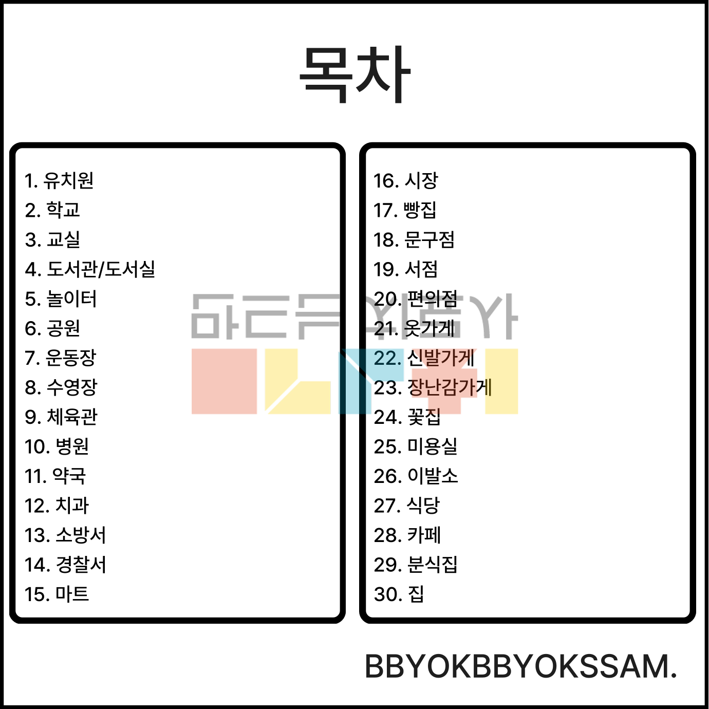 49가지 장소 어휘로 구성되어있습니다. 왼쪽은 장소, 오른쪽은 장소를 활용하여 문장을 산출할 수 있도록 제작하였습니다.