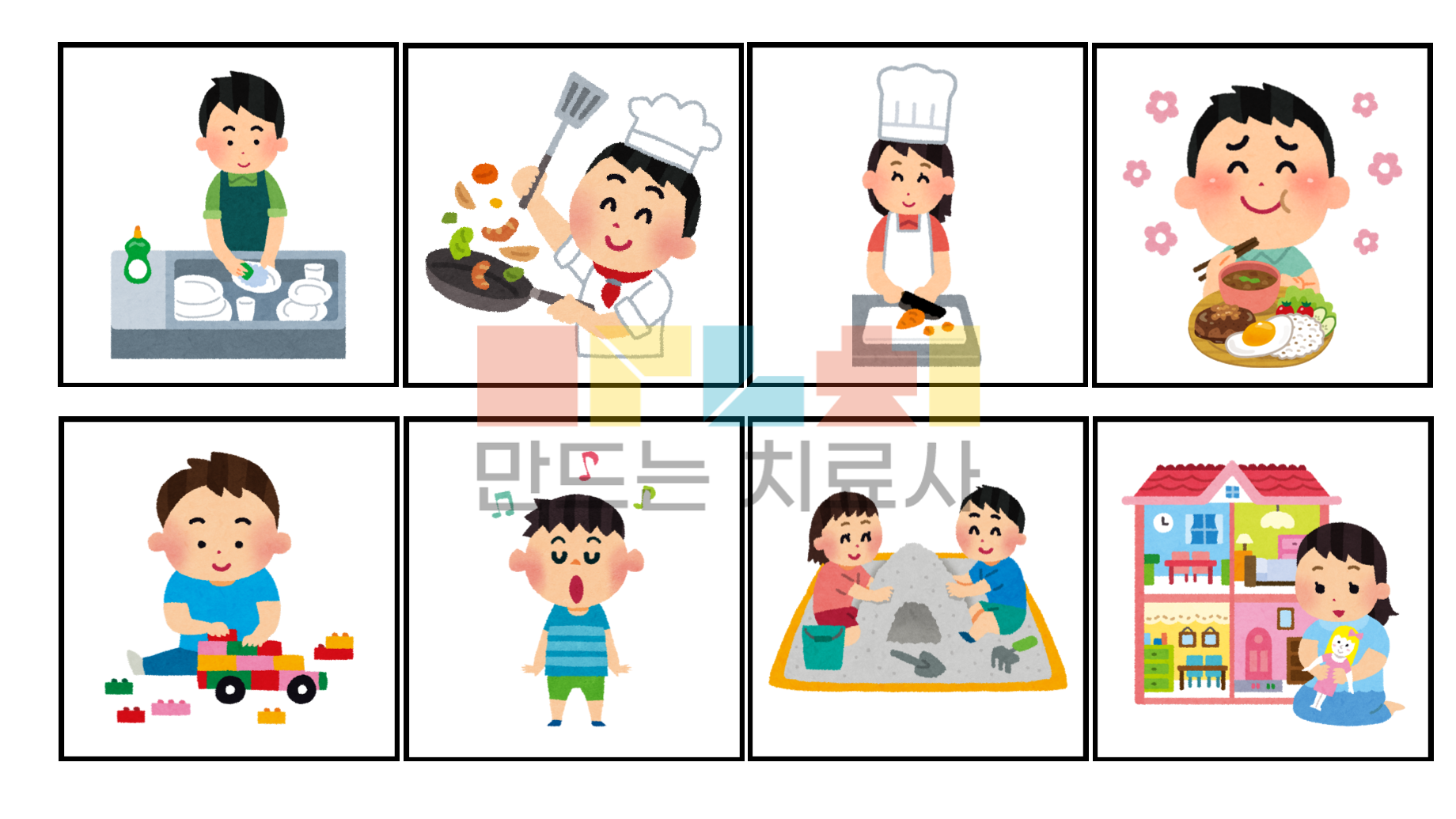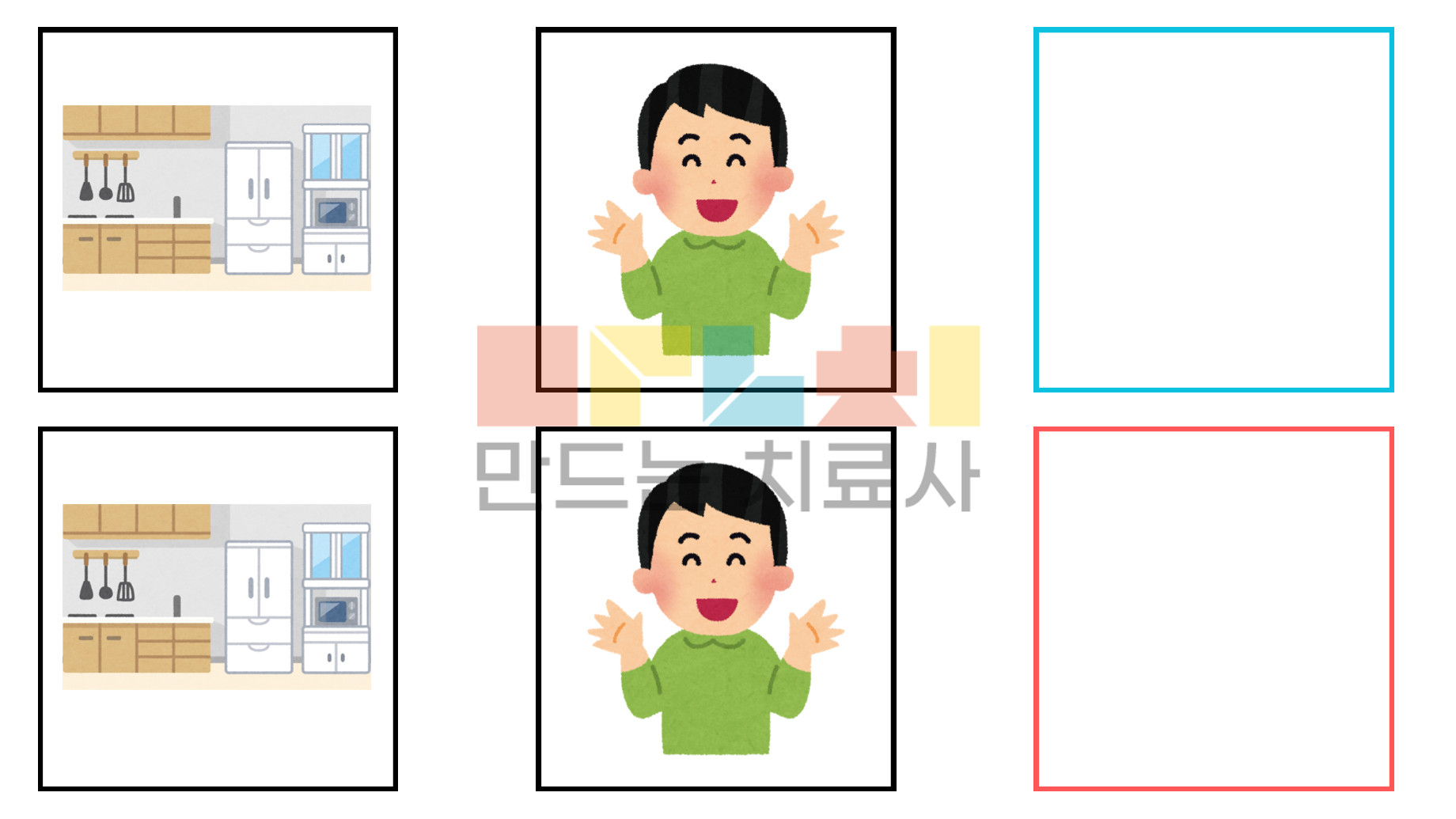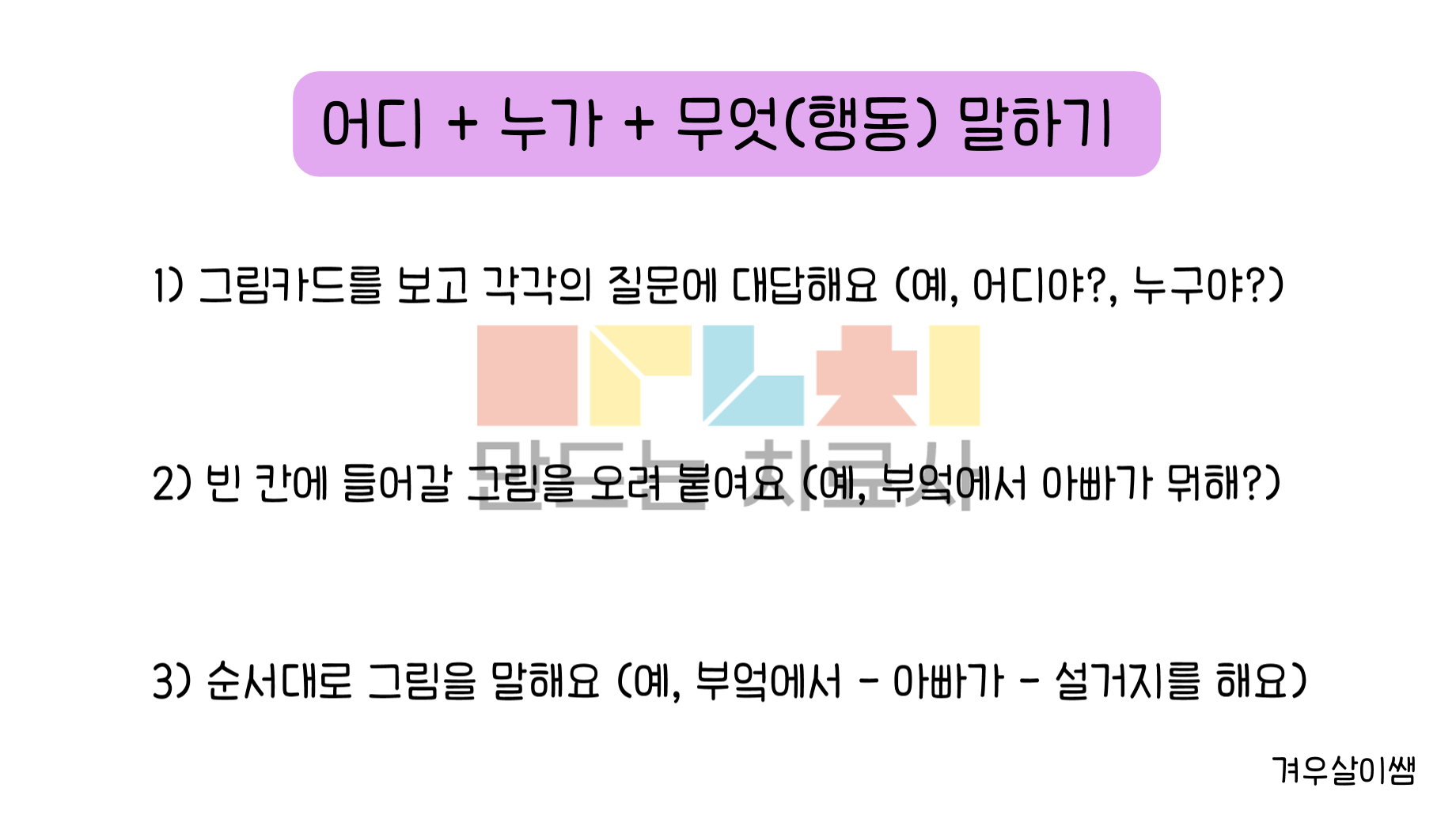 어디 + 누가 + 무엇(행동) 말하기 [집(부엌)/어린이집(유치원)]