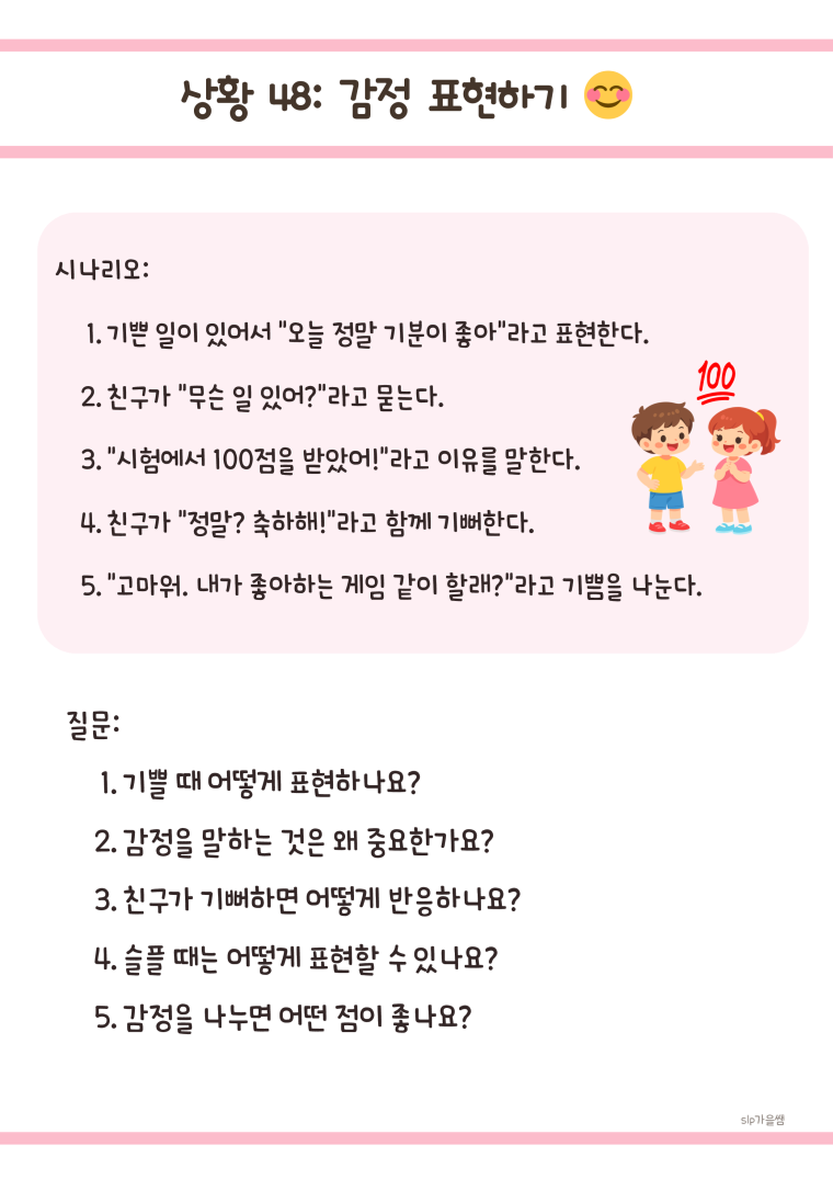 초등 저학년 맞춤 | 화용언어 & 어휘 발달 ✅ 50개 실생활 상황 시나리오 ✅ 250개 질문으로 체계적 학습 ✅ 그룹수업, 개별치료 모두 활용 가능 ✅ 유창성 장애 아동 대본으로도 완벽! 📌 일상생활부터 문제해결까지 병원·마트·식당·도서관·갈등해결·감정표현 등 실제로 쓰는 표현을 자연스럽게! #언어치료 #역할놀이 #화용언어 #초등저학년 #언어발달 #그룹수업 #유창성장애 📊 구성 총 50개 상황 (각 상황 5줄 시나리오 + 5개 질문) 총 250개 질문 수록 5개 카테고리 체계적 분류 🎯 카테고리별 구성 일상생활 기본 (10개): 병원, 마트, 식당, 도서관, 빵집, 요리사, 선생님, 약국, 갈등 해결, 우체국 공공장소 (10개): 버스, 놀이터, 영화관, 미용실, 은행, 공원, 박물관, 수영장, 음악회, 동물원 직업 체험 (10개): 의사, 경찰관, 소방관, 요리사, 점원, 배달원, 기자, 버스 기사, 미용사, 수의사 문제 해결 (10개): 물건 분실, 친구 위로, 차례 지키기, 실수 사과, 의견 차이, 도움 요청, 공평하게 나누기, 약속 지키기, 게임에서 지기, 거절하기 고급 사회적 상황 (10개): 첫 만남, 칭찬, 초대, 생일 파티, 전화 예절, 어른께 공손하게, 협동 청소, 감정 표현, 차이 존중, 감사 표현 👨👩👧👦 활용 Tip *그룹수업 시 상황을 읽고 역할을 정해요 번갈아가며 각자 역할을 맡아봐요 다른 친구의 연기를 보고 피드백을 나눠요 실제 소품을 활용하면 더 재미있어요! *유창성 아동과 함께 먼저 천천히 읽으며 내용을 파악해요 편안한 속도로 대본을 따라 말해봐요 익숙해지면 자연스럽게 변형해봐요 성공 경험을 많이 쌓도록 격려해요! *화용언어 목표 시 상황별 핵심 표현을 먼저 정리해요 왜 그렇게 말해야 하는지 이유를 설명해요 비슷한 상황에서 응용할 수 있도록 연습해요 가정에서도 연습할 수 있도록 안내해요!