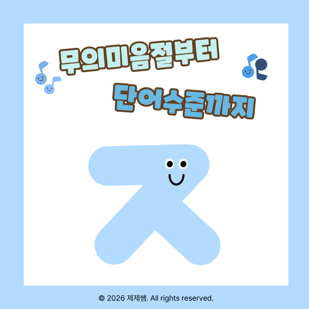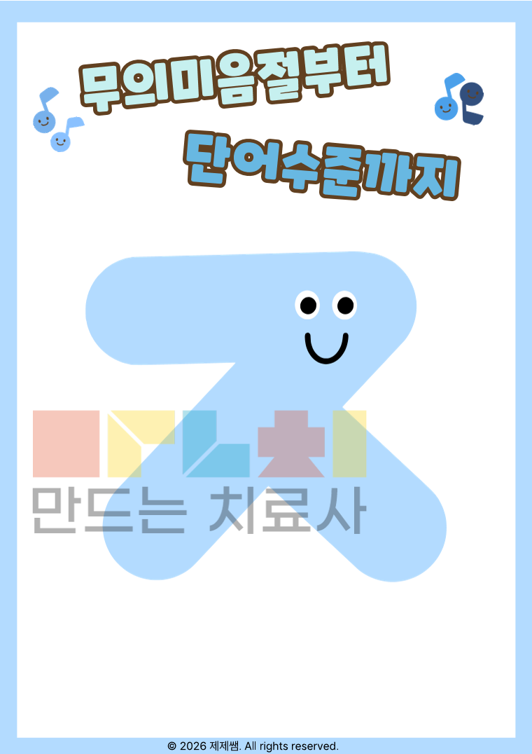 📌 자료 소개 경구개음 초성 /ㅈ/ 발음이 어려운 아동을 위한 단계별 조음 훈련 자료입니다. 무의미음절 반복부터 시작하여 1음절 → 2음절 → 3음절 이상 단어까지 점진적으로 확장하도록 구성되어 있어 기초 조음 안정화부터 일반화 단계까지 활용 가능합니다. 📌 이런 아이에게 추천해요 /ㅈ/을 ㄷ, ㅅ 등으로 대치하는 아동 단어 수준에서 정확도가 불안정한 아동 반복 연습이 필요한 조음 지연 아동 음절 길이가 늘어나면 오류가 증가하는 경우 📌 자료 구성 특징 ✔ 무의미음절 반복으로 정확한 위치 고정 훈련 ✔ 음절수별 체계적 단어 배열 ✔ 반복 과제로 자동화 유도 ✔ 시각적 그림 제시로 의미 연결 강화 ✔ 성공 표시 시스템으로 동기 유발 📌 활용 방법 치료실 개별수업용 가정 연습 과제용 정확도 체크 및 기록용 자료로 활용 가능