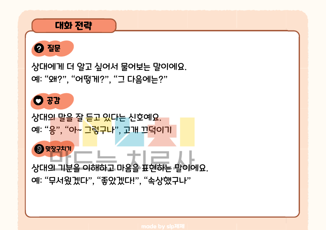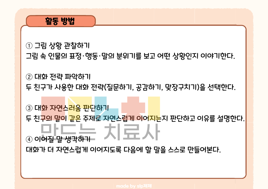 📘 우리의 대화가 이어지는지 맞춰줘 대화는 하고 있지만… 정말 “이어지고” 있을까요? 이 자료는 아이들이 대화의 자연스러움을 스스로 판단하고, 어떻게 말해야 대화가 이어지는지 배우는 화용 언어 훈련 자료입니다. 💡 이런 아이에게 추천해요 ✔ 자기 말만 하고 주제를 자주 바꾸는 아이 ✔ 친구 말에 엉뚱하게 대답하는 아이 ✔ 질문·공감 표현이 어려운 아이 ✔ 대화가 자주 끊기는 아이 ✔ ASD / 사회적 의사소통 어려움이 있는 아동 📚 활동 구성 ① 그림 상황 관찰하기 인물의 표정, 말의 분위기, 상황 맥락 파악 ② 대화 전략 선택하기 질문 공감 맞장구 ③ 대화 자연스러움 판단하기 “이 대화는 이어지고 있을까?” 이유 설명까지 함께 연습 ④ 이어질 말 생각하기 대화를 자연스럽게 이어갈 수 있는 문장 만들기 🎯 기대 효과 ✨ 대화 맥락 유지 능력 향상 ✨ 타인의 말 이해 및 반응 훈련 ✨ 사회적 추론 능력 강화 ✨ 실제 또래 대화에 적용 가능 👩⚕️ 치료 현장에서 이렇게 활용하세요 개별 화용 치료 ASD 사회성 수업 초등 저학년 사회성 그룹 또래 관계 지도 활동 📌 자료 특징 ✔ 한 눈에 이해되는 그림 상황 ✔ 단계적 사고 구조 ✔ 전략 개념 정리 포함 ✔ 치료사가 바로 사용할 수 있는 구성