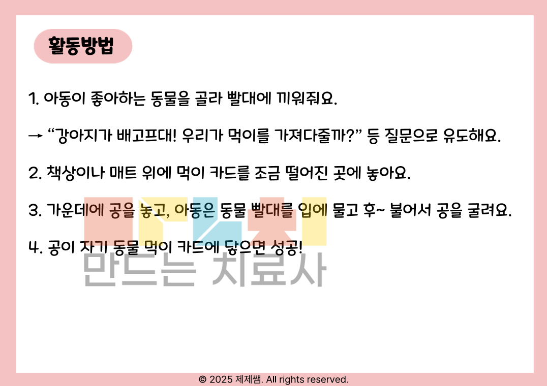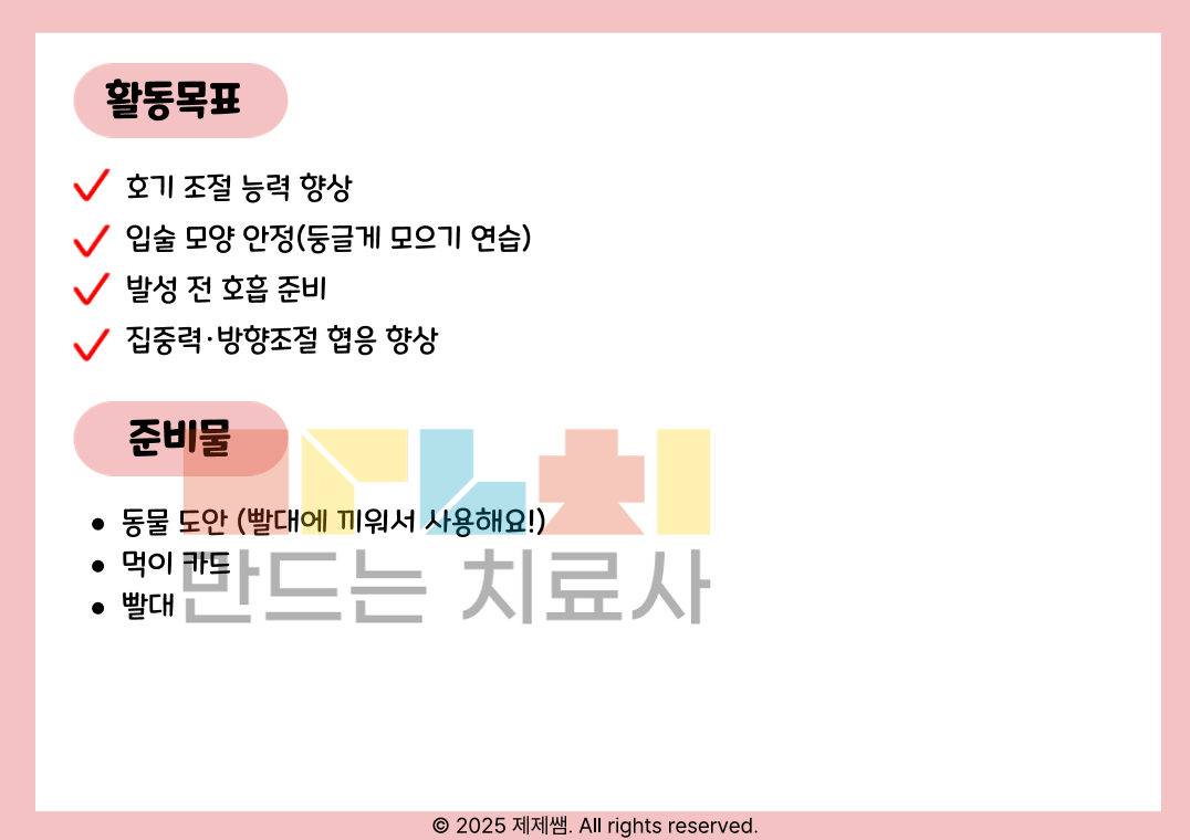 🌬️ 호흡 훈련 재미있게 해요! ① 빨대 놀이로 배우는 기초 구강·호흡 조절 활동지 📌 이런 친구들에게 추천해요! 입 모양이 잘 모이지 않는 아동 발성 전에 숨 조절이 어려운 아동 빨대 놀이를 좋아하는 유아·초등 저학년 조음 준비 단계가 필요한 아동 🎯 활동 목표 ✔ 호기 조절 능력 향상 ✔ 입술 둥글게 모으기 연습 ✔ 발성 전 호흡 준비 ✔ 집중력 및 방향 조절 협응 향상 🧸 활동 방법 (간단해요!) 아동이 좋아하는 동물 카드를 선택해요. 먹이 카드를 조금 떨어진 곳에 놓아요. 동물 빨대를 입에 물고 “후~” 불어 공을 굴려요. 공이 먹이 카드에 닿으면 성공! 🎉 놀이처럼 진행되기 때문에 아이들이 “훈련”이 아니라 “게임”처럼 참여해요 😊 📦 구성 동물 도안 (육상/바다/공룡 등 다양하게 구성) 먹이 카드 세트 활동 안내 페이지 포함 ✔ 컬러 인쇄용 ✔ 라미네이팅 후 반복 사용 가능 ✔ 개인치료 / 그룹치료 모두 활용 가능 💡 이런 점이 좋아요! 단순 불기 활동이 아닌 목표 지향적 놀이 구조 시각적 단서 제공으로 동기 유발 ↑ 단계 조절 가능 (거리 조절 / 목표물 크기 조절) 👩🏻⚕️ 치료 현장에서 바로 사용 가능 준비물은 빨대 + 작은 공이면 끝! 수업 시작 5분 워밍업으로도 좋아요.