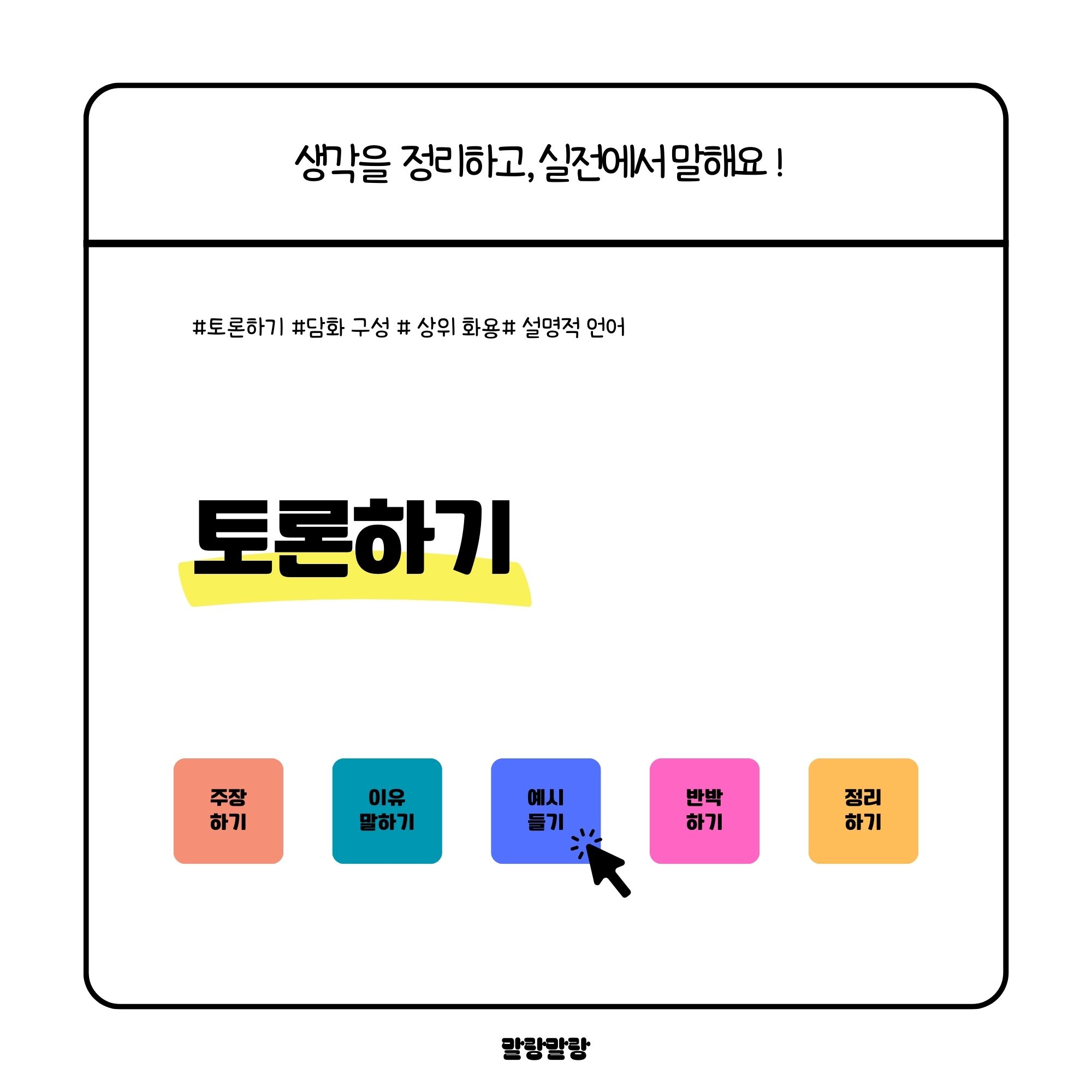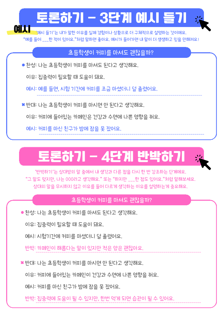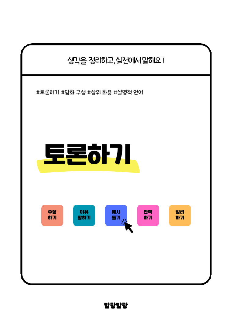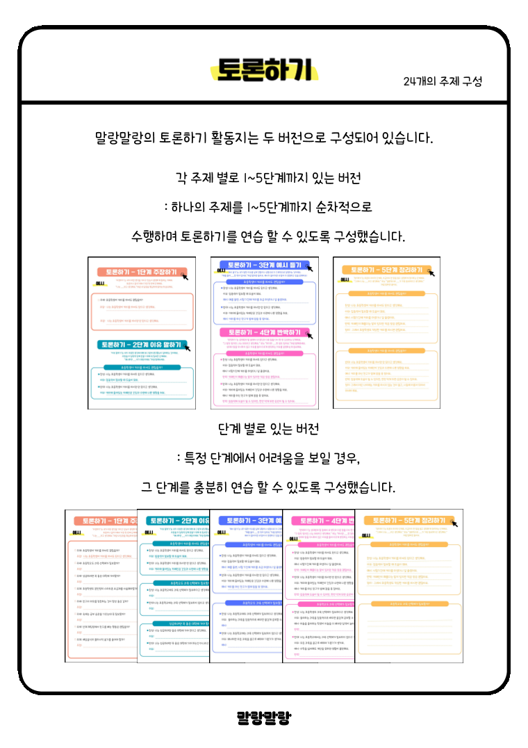 본 활동지는 생각을 조리 있게 꺼내는데 서툰 대상자들을 위한 '생각 정리 지도'가 될 수 있도록 5단계로 구성했습니다. 단계 별 활동을 통해 막연한 주장에 힘을 싣는 법을 배우고, 상대의 의견을 존중하며 대화하는 전략적인 소통 방식을 자연스럽게 익힐 수 있습니다. 단순한 말하기를 넘어 논리적인 담화 구조를 익히고 싶은 대상자들에게 활용할 수 있습니다.