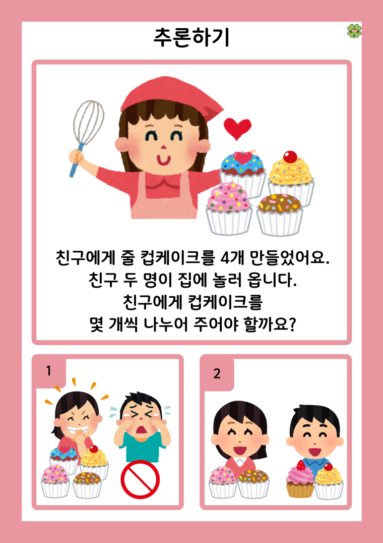 🎯 [다복쌤네 컵케이크 가게] 활동 목표 (무료 나눔 ver.) 1. 실생활 맥락에서의 수량 개념 및 나눗셈 기초 원리 습득 - 컵케이크를 친구들에게 나누어 주는 상황을 통해 '전체'를 '부분'으로 공평하게 배분하는 나눗셈의 기초 개념을 이해하고 수량 추론 능력을 기른다. 2. 시·청각 단서를 활용한 대상 추론 및 인출 능력 강화 - "음~ 달콤해!", "나는 빨간색을 좋아해"와 같은 감각적/기호적 단서를 듣거나 읽고, 여러 개의 컵케이크 중 조건에 맞는 정확한 대상을 변별하여 찾아낼 수 있다. 3. 절차적 사고를 통한 실행 기능 향상 - 컵케이크가 만들어지는 순서를 파악하고 재구성하는 과정을 통해, 목표를 달성하기 위한 단계별 실행 계획을 이해하고 논리적 사고력을 높인다. 4. 창의적 자기표현 및 언어적 확장 능력 배양 - 자신이 만든 컵케이크의 맛과 특징을 상상하여 색칠하고, 이를 언어로 표현해보는 활동을 통해 미적 감각과 구어 표현력을 동시에 함양한다. 💡 직관적인 활동 구성 : "재료 찾기 → 만들기 순서 → 나누기(수학) → 주문하기(추론) → 색칠하기"까지, 한 권의 활동지로 인지와 창의성을 동시에 잡을 수 있습니다. 💡 추천 수업: 수 개념이 필요한 아동, 단서를 듣고 맞추는 변별 훈련이 필요한 아동, 즐거운 놀이 중심의 인지 수업을 원하는 선생님.