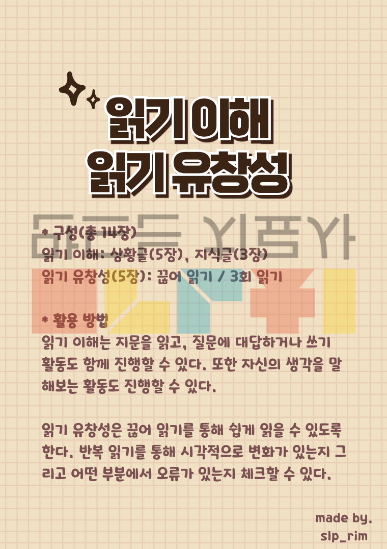 📚 읽기 이해 · 읽기 유창성 훈련 자료 ✔ 일상 글 아이들이 공감할 수 있는 생활 주제로 읽기 흥미를 높여요. ✔ 설명 글 정보를 이해하고 핵심을 파악하는 연습을 할 수 있어요. ✔ 끊어 읽기 표시 제공 의미 단위로 끊어 읽도록 구성해 읽기 속도와 정확도, 문장 이해력을 함께 향상시킵니다. 읽기만 하는 활동이 아니라 ✔ 정확하게 읽고 ✔ 자연스럽게 읽고 ✔ 이해하며 읽는 힘을 기르는 자료입니다 🎯