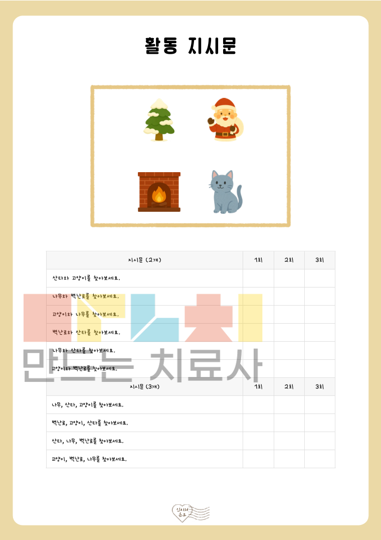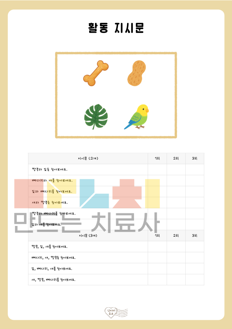 안녕하세요. 인지의 온도입니다. 본 자료는 ‘듣고 고르기(기본)’ 활동지로, 4개의 그림 중에서 2개 또는 3개의 낱말을 듣고 찾아보는 활동으로 구성되어 있습니다. 제시된 낱말을 듣고 해당 그림을 찾아보는 활동을 통해 청각주의력과 어휘 이해 능력을 기를 수 있습니다. ‘잘 듣고 찾아요’ 시리즈는 기초–기본 난이도로 구성되었습니다. 교사가 제시한 낱말을 잘 듣고 그림을 선택하는 과정을 통해 청각적 주의 집중, 어휘 이해, 들은 정보를 기억하고 처리하는 능력을 기를 수 있습니다. ◎표지1, 안내서1, 활동지30(그림카드15장-지시문15장) * 지시문에는 아동 반응을 체크할 수 있는 체크리스트가 함께 있습니다.