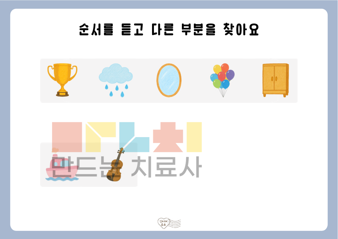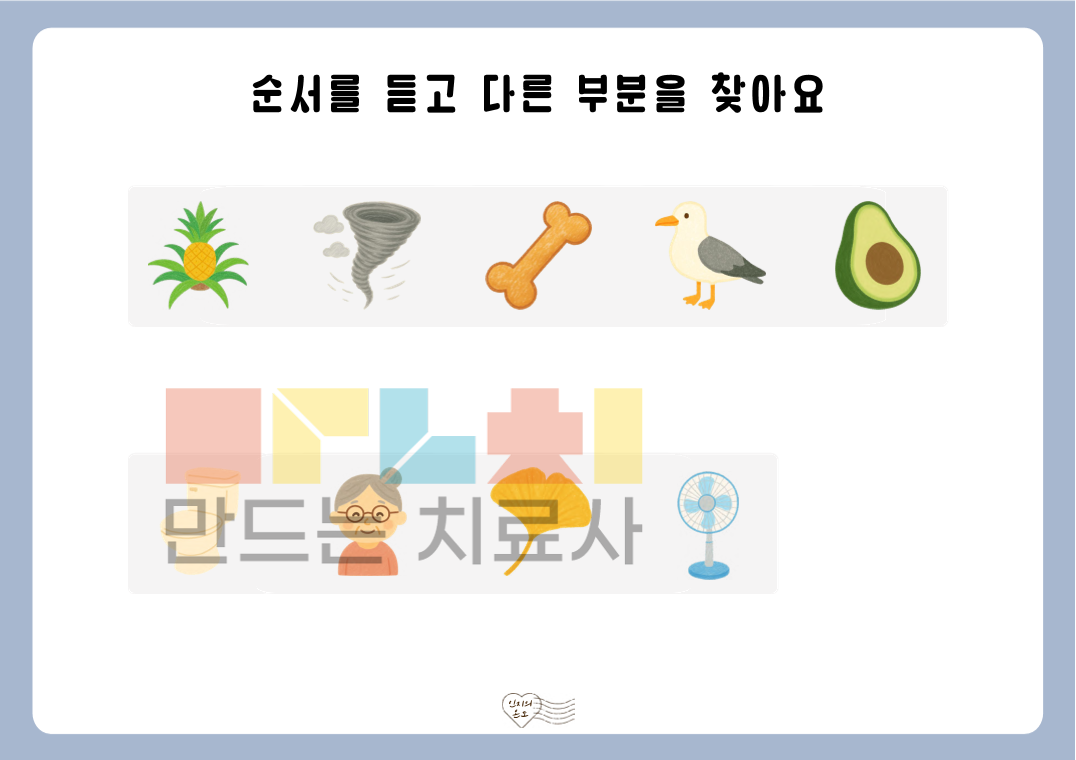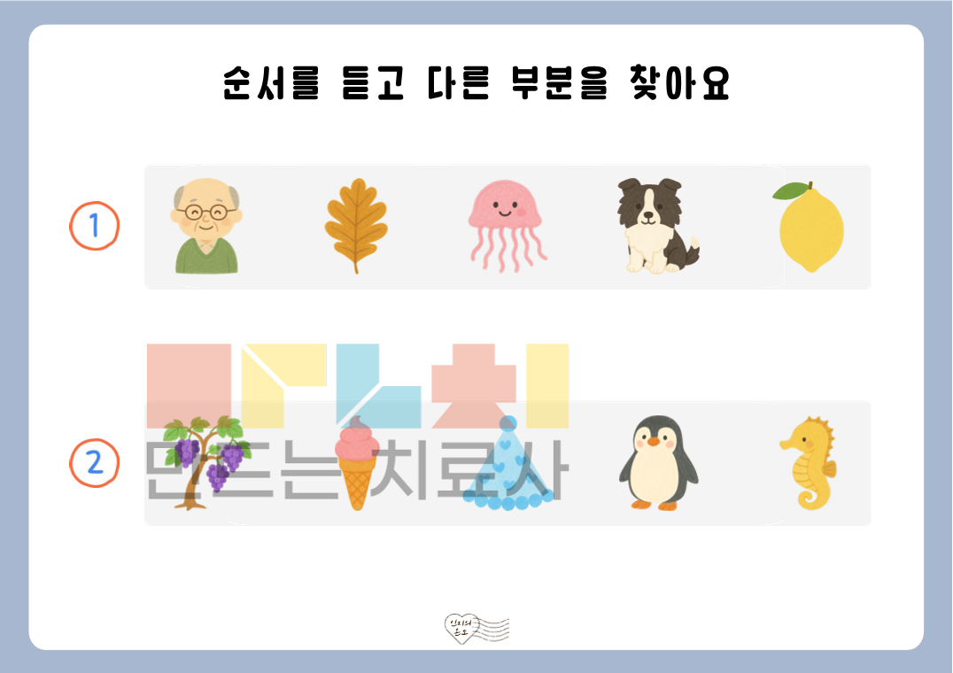 안녕하세요. 인지의 온도입니다. 본 자료는 ‘듣고 순서 비교하기’ 활동지로, 제시된 낱말의 순서를 듣고 순서상 다른 부분을 찾아보는 활동으로 구성되어 있습니다. 낱말을 들으며 순서를 비교하는 과정을 통해 청각 주의력, 순서 처리 능력, 정보 처리 능력을 기를 수 있습니다. ◎표지1, 안내서1, 활동지40(3~5개: 장당 2문항 5장, 6~10개: 장당 1문항 5장)