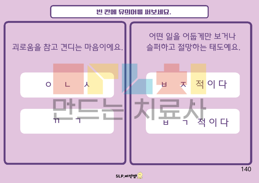 안녕하세요, 삐약쌤입니다. 우리 아이들이 반의어는 생각보다 잘 알고 있는데, 유의어를 어려워 하는 경우가 많습니다. LSSC평가를 돌리면서 더 여실히 느끼는 점이기도하구요. 이 유의어 어휘들은 아주 쉬운 단계의 어휘는 아닙니다. 관계나 감정등과 관련된 유의어 어휘들이기 때문에 유치원~초등1~2학년 수준의 어휘를 익힐 수 있는 친구들을 위해 마든 자료입니다. 구성은 이렇게 되어 있습니다. 1단계: 유의어 2-3개를 상황예시와 함께 익히기 2단계: 익혔던 유의어를 그림 상황예시를 보고 써보기 3단계: 정확한 사전적 의미를 알고, 나의 예를 들어보기 4단계: 익혔던 유의어를 기억해서 초성 힌트로 마무리 내용으로는 감정 유의어 행동, 생각, 상태 유의어 관계(상호작용) 유의어 를 포함하였습니다. 예시 자료를 보시면 어떤 내용인지 한 눈에 알 수 있어요^^ 아이들과 유용하게 쓸 수 있기를 바랍니다. <저작권 관련 공지> 1.본 자료의 모든 내용과 디자인은 삐약쌤에게 있으며, Canva의 라이센스 규정을 준수하여 제작하였습니다. 2.본 결과물은 다수의 요소를 조합하여 만든 '완성된 디자인'으로, 캔바의 순정 요소 하나만으로 구성된 디자인이 아님을 밝힙니다. 3.본 자료를 구매하신 고객님은 치료실, 학교, 가정 내에서 교육 및 치료 목적으로 인쇄하여 사용할 수 있습니다. 4.본 자료의 전체 또는 일부를 무단으로 복제, 수정하여 온/오프라인상에 재배포하거나 판매하는 행위는 엄격히 금지도비니다.(캔바의 개별 디자인 요소를 따로 추출하여 상업적으로 사용하는 것은 캔바 이용 약관 위반입니다.) 5.저작권자의 허락 없이 무단 전재 및 재배퐇시, 저작권법에 따라 민/형사상 책임을 질 수 있습니다.