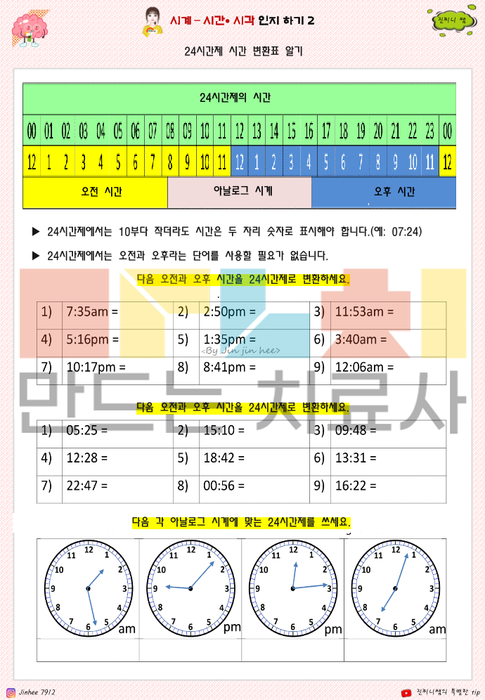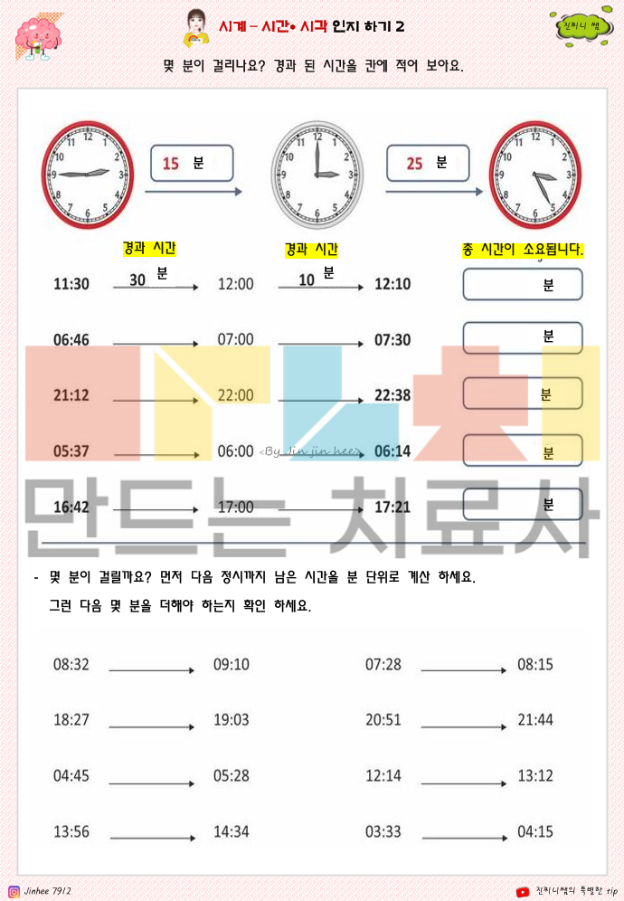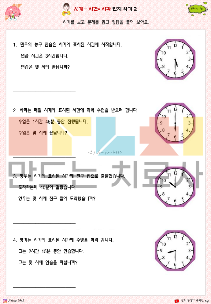 1️⃣ 시간 개념 이해 수준 -정시(○시) 읽을 수 있는지, 30분(○시 반) 개념을 이해하는지, 분 단위(10분, 20분 등) 확장이 가능한지, 시침과 분침의 역할을 구분하는지 👉 단순히 숫자를 읽는 것이 아니라 ‘시간의 구조’를 이해하고 있는지를 알 수 있습니다. 2️⃣ 시지각 + 주의집중 능력 -시계 바늘의 위치 차이를 구별하는 능력, 비슷한 시각 그림을 비교하는 능력, 작은 변화를 인식하는 시각 변별력 👉 이는 읽기, 수학 자리값, 도형 인지와도 연결됩니다. 3️⃣ 순서 개념과 시간 흐름 이해 -하루 일과를 시간 순서로 배열할 수 있는지, “지금–조금 후–나중”의 개념을 아는지, 시간에 맞춰 행동을 준비할 수 있는지 👉 학교생활, 등교 준비, 약속 지키기와 직접 연결됩니다. 4️⃣ 수 개념 확장 가능성 -5씩 건너뛰기 세기 가능 여부, 60분 구조 이해 여부, 시계 숫자를 통한 수 배열 이해 👉 이는 곱셈 개념, 단위 이해로 이어집니다. 5️⃣ 실생활 적용 능력 -이 자료를 통해 알 수 있는 핵심은 “아이가 시간을 실제 생활에서 사용할 준비가 되어 있는가?" 입니다. 예) 3시에 수업 시작 → 스스로 준비 가능한가 10분 남았다 → 기다릴 수 있는가 7시 반 → 아침 준비 시작 이해 가능한가? - “시계 인지는 단순히 시간을 읽는 학습이 아니라, 아이의 주의집중력, 시지각 능력, 수 개념, 순서 이해 능력을 함께 보는 중요한 영역입니다. 시간을 이해하면 약속을 지키고, 기다리고, 준비하는 힘이 자랍니다.”