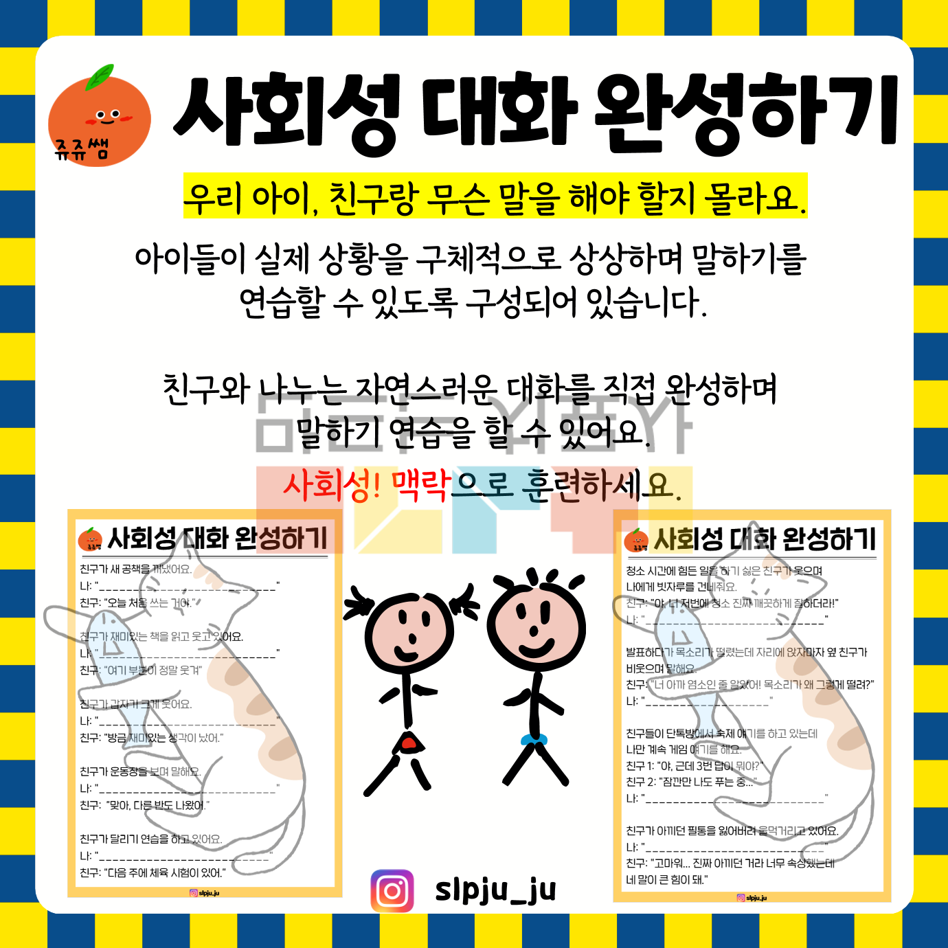 안녕하세요 쥬쥬쌤입니다. 우리 아이, 친구랑 무슨 말을 해야 할지 몰라요. 아이들이 실제 상황을 구체적으로 상상하며 말하기를 연습할 수 있도록 구성되어 있습니다. 친구와 나누는 자연스러운 대화를 직접 완성하며 말하기 연습을 할 수 있어요.