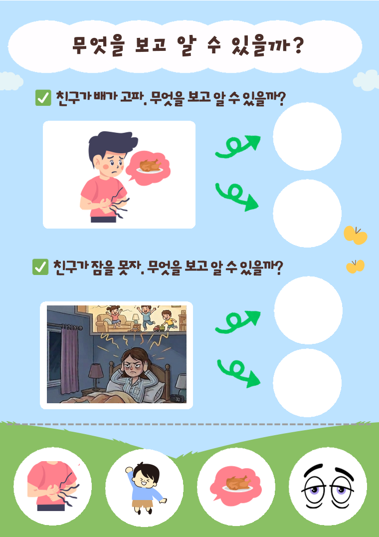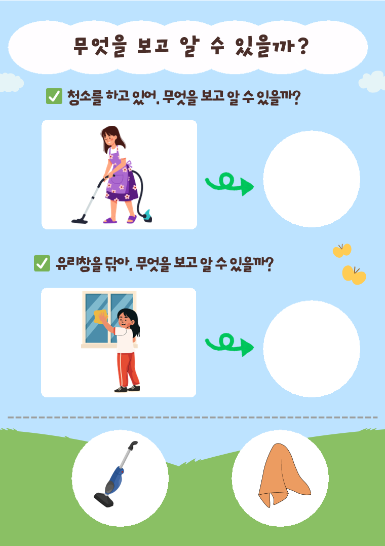 <활동 목표 및 효과> 목표 그림 속 단서를 보고 상황을 추론하는 능력(단서 기반 추론)을 향상한다. 상황과 관련된 핵심 단서를 찾아 말로 설명할 수 있다.