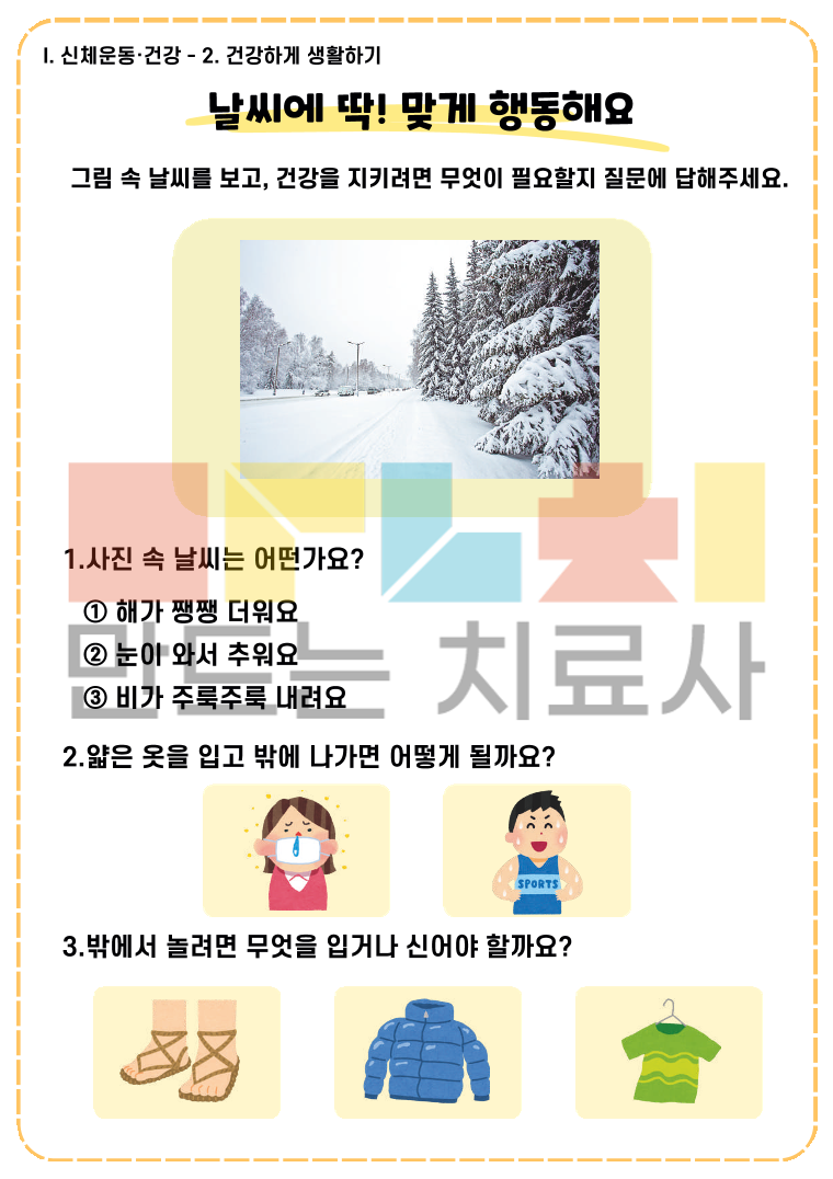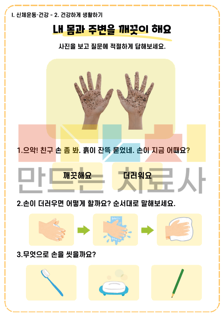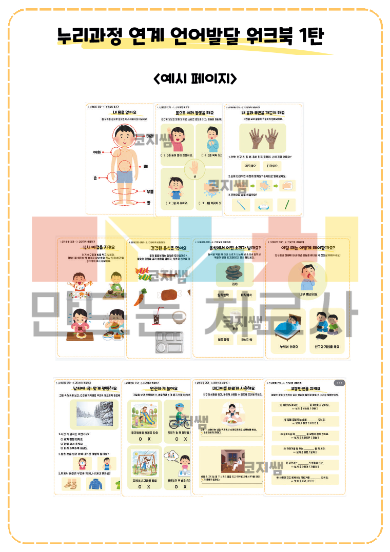 2019 누리과정 중 신체운동, 건강 영역을 바탕으로 구성한 워크북입니다. [ I. 신체운동·건강 ] 파트 2019 개정 누리과정 중 신체운동·건강 영역을 바탕으로 제작 일상생활과 밀접한 주제를 통해 자연스럽게 어휘와 표현력을 키울 수 있도록 구성 누리과정 교육목표에 맞게 생각하고 말하고 쓰는 활동 제공 <목차> 1. 신체활동 즐기기 1)내 몸을 알아요 2)몸으로 여러 활동을 해요 2. 건강하게 생활하기 1)내 몸과 주변을 깨끗이 해요 2)식사 예절을 지켜요 3)건강한 음식을 먹어요 4)음식에서 어떤 소리가 날까요? 5)내 몸의 배터리는 무슨 색깔일까요? 6)이럴 때는 어떻게 해야할까요? 3. 안전하게 생활하기 1)안전하게 놀아요 2)미디어를 바르게 사용해요 3)교통안전을 지켜요 4)위험할 때 도움을 요청해요
