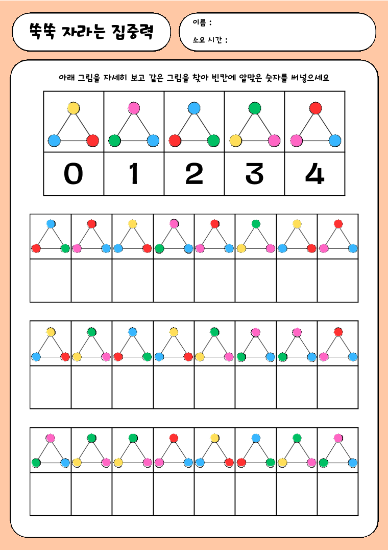 ★ 주의집중 향상 워크북 3탄입니다. ★ 처리속도 향상과 주의집중 향상을 위한 워크북입니다. ★초등학교 전학년 대상입니다.