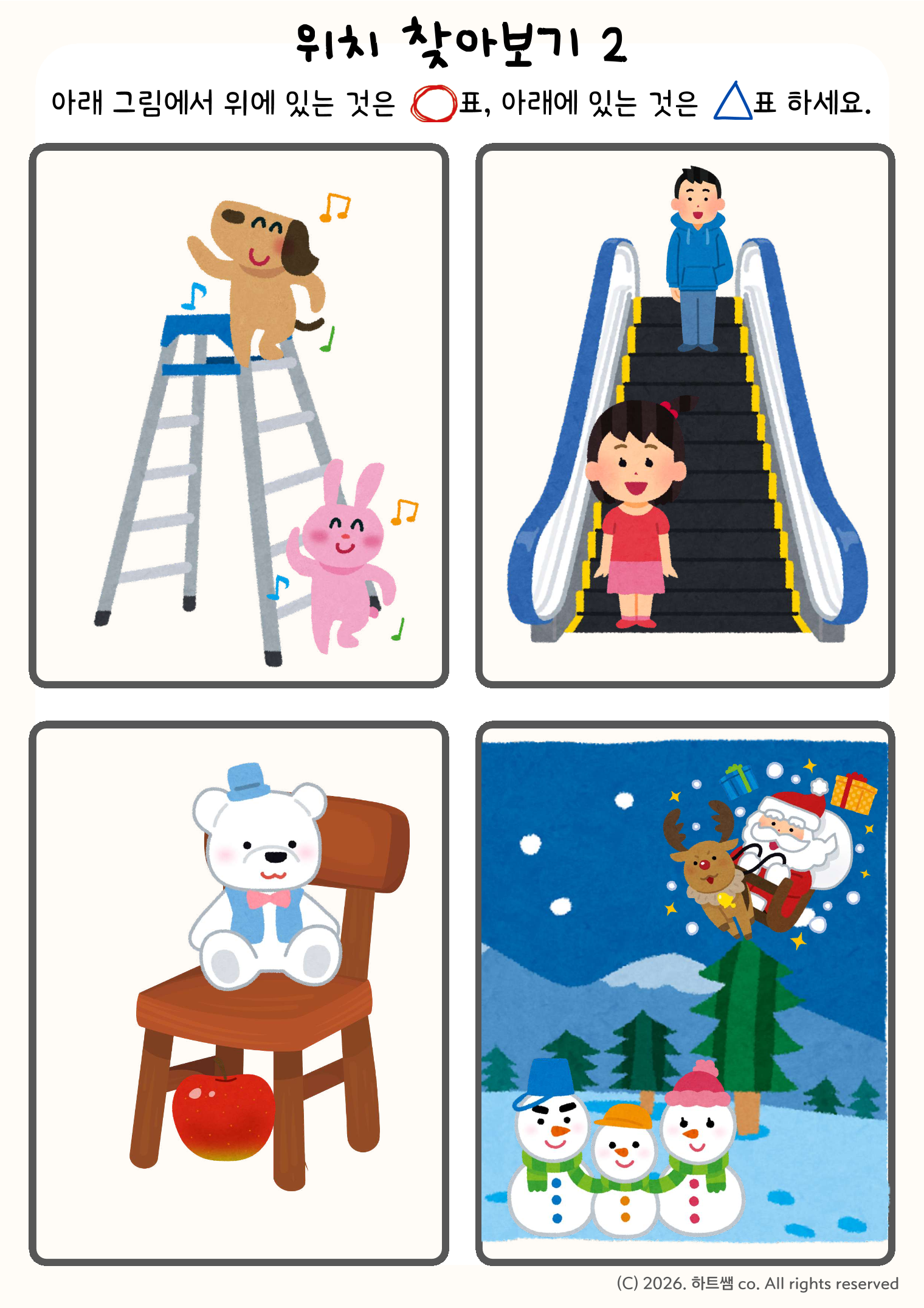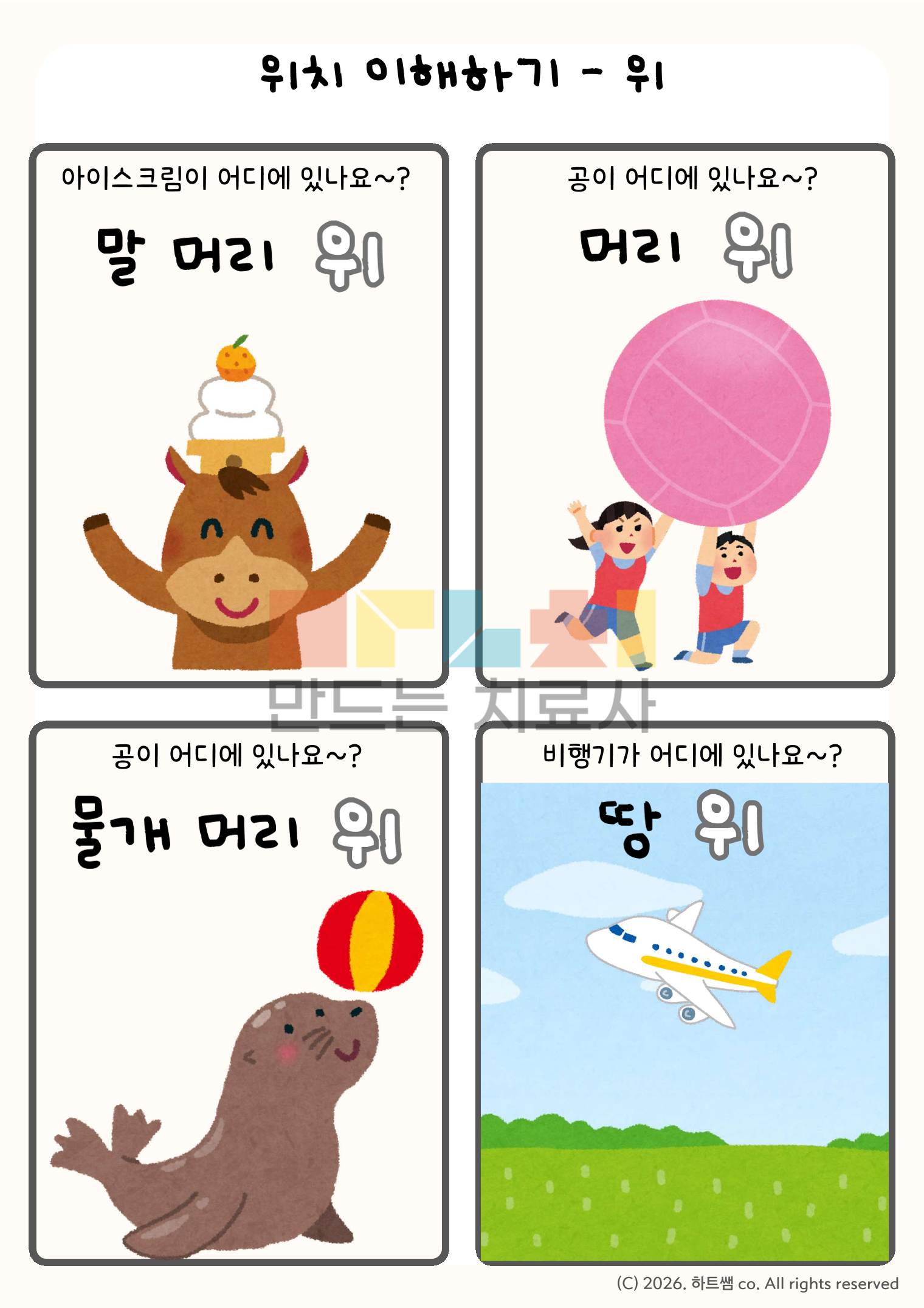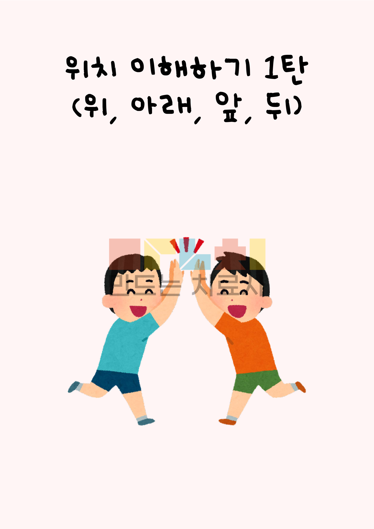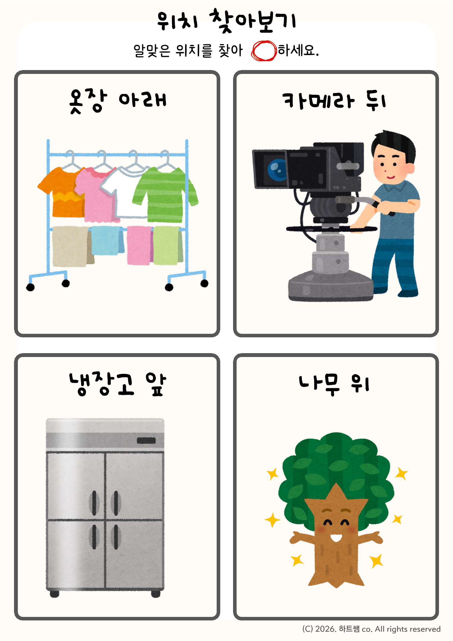 위치 이해하기 1탄 활동지는 6가지 활동지로로 구성되어 있으며, 즐겁게 활동하며 어휘 확장, 시각 주의집중, 시각정보를 기억하고 확장할 수 있는 활동으로 구성되어 있어요. 목표: 어휘 확장, 시각 주의집중, 시각정보 기억 및 확장, 알맞은 위치 이해하기 6가지 위치 개념을 이해할 수 있는 활동지로 구성되어 있습니다. 다양한 활동지를 선생님과 함께 풀어보며 위치에 대해 이야기를 나누고, 위치를 찾고 익히는 과정에서 어휘를 확장하고 시각적 주의집중과 위치 이해 능력을 향상시킬 수 있습니다. 활동지는 총 33P, PDF(A4 사이즈) 표지 1장, 활동지27장, 정답지 5장입니다.:D 2차 수정 및 무단 공유는 불가합니다. 다운로드 후 인쇄 시 사진이 깨지고 파일이 작은 경우 메일로 연락주세요.(파일을 다시 보내드립니다.) 오류, 수정사항은 메일로 연락주세요. 수정 후 파일을 다시 보내드리겠습니다 :D (som-1221@nate.com)