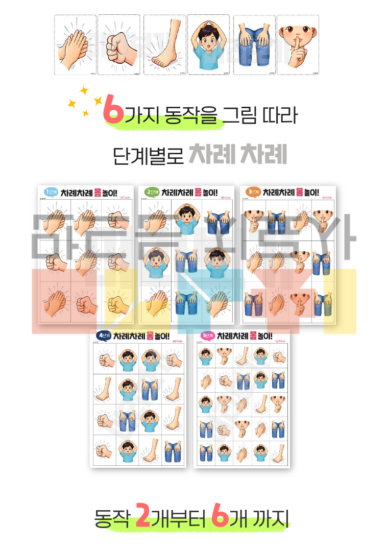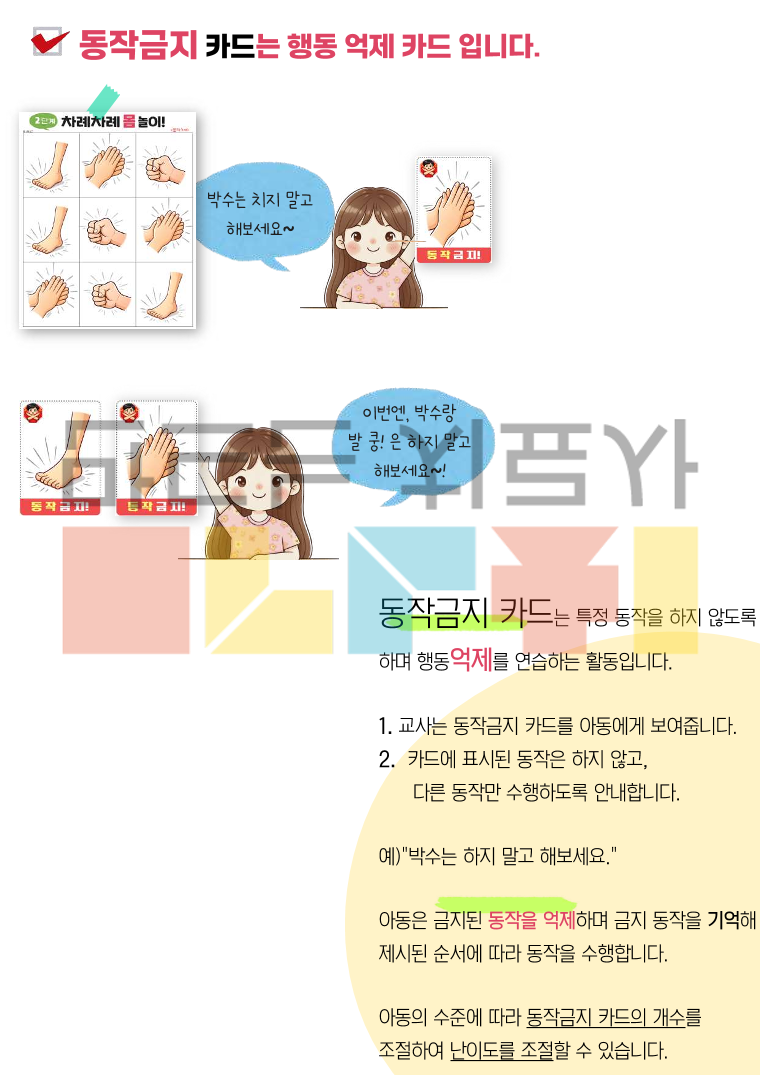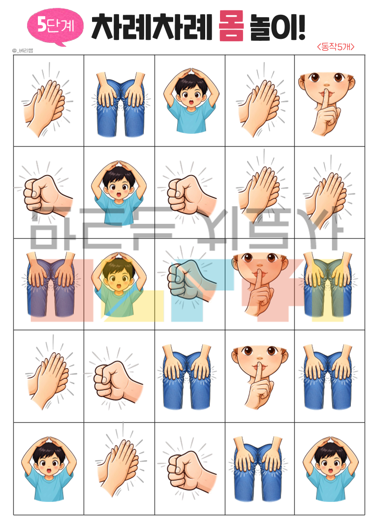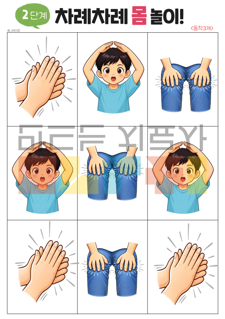 🧠 차례차례 몸놀이 보고, 기억하고, 순서대로 움직여요! 차례차례 몸놀이는 다양한 신체 동작을 따라 하며 주의집중, 행동 억제, 실행기능을 자연스럽게 연습할 수 있는 활동입니다. 수업 전 집중력 워밍업 활동으로 활용하기 좋으며 아이들이 즐겁게 참여하며 규칙 이해와 자기조절 능력을 기를 수 있습니다. ✔ 추천 대상 • 주의집중이 어려운 학령전·학령기 아동 • 충동 조절이 어려운 ADHD 성향 아동 • 규칙 이해와 실행이 어려운 경계선 지능 및 느린 학습자 • 실행기능 및 자기조절 훈련이 필요한 아동 • 수업 전 집중력 워밍업 활동이 필요한 아동 ✔ 기대효과 • 주의집중력 향상 제시된 동작을 관찰하고 순서에 맞게 수행하며 집중력을 기릅니다. • 행동 억제 능력 발달 금지된 동작을 하지 않도록 조절하며 충동 억제 능력을 연습합니다. • 실행기능 발달 규칙을 기억하고 적절한 행동을 선택하며 실행기능을 강화합니다. • 작업기억 강화 동작 순서를 기억하고 수행하며 작업기억 능력을 기릅니다. • 신체 협응 능력 향상 다양한 신체 동작을 수행하며 몸의 협응과 반응 조절 능력을 키웁니다.