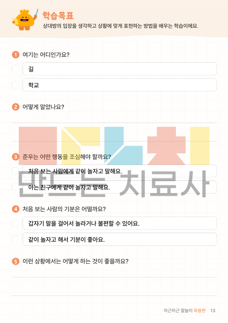 차근차근 말놀이 화용편은 일상에서 일어나는 다양한 상황을 통해 상대방의 마음을 생각하고 상황에 맞게 말하고 행동하는 방법을 차근차근 익히는 화용 언어 학습지입니다.