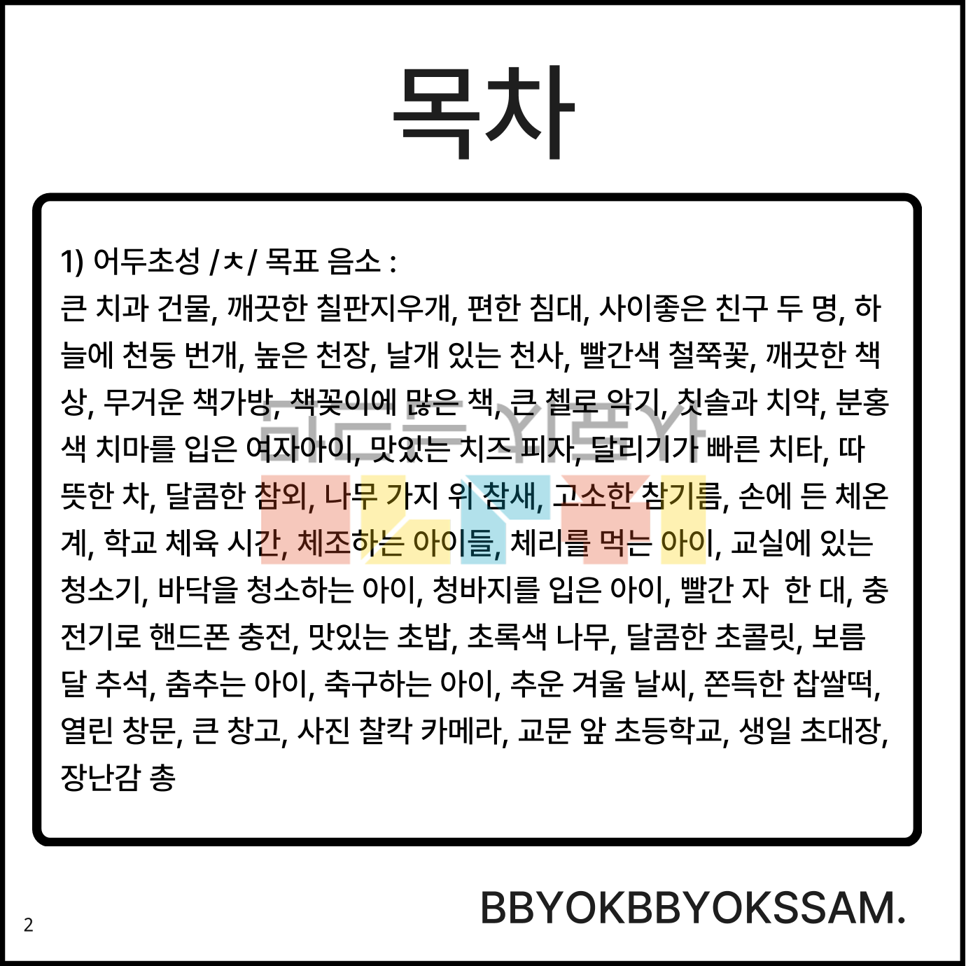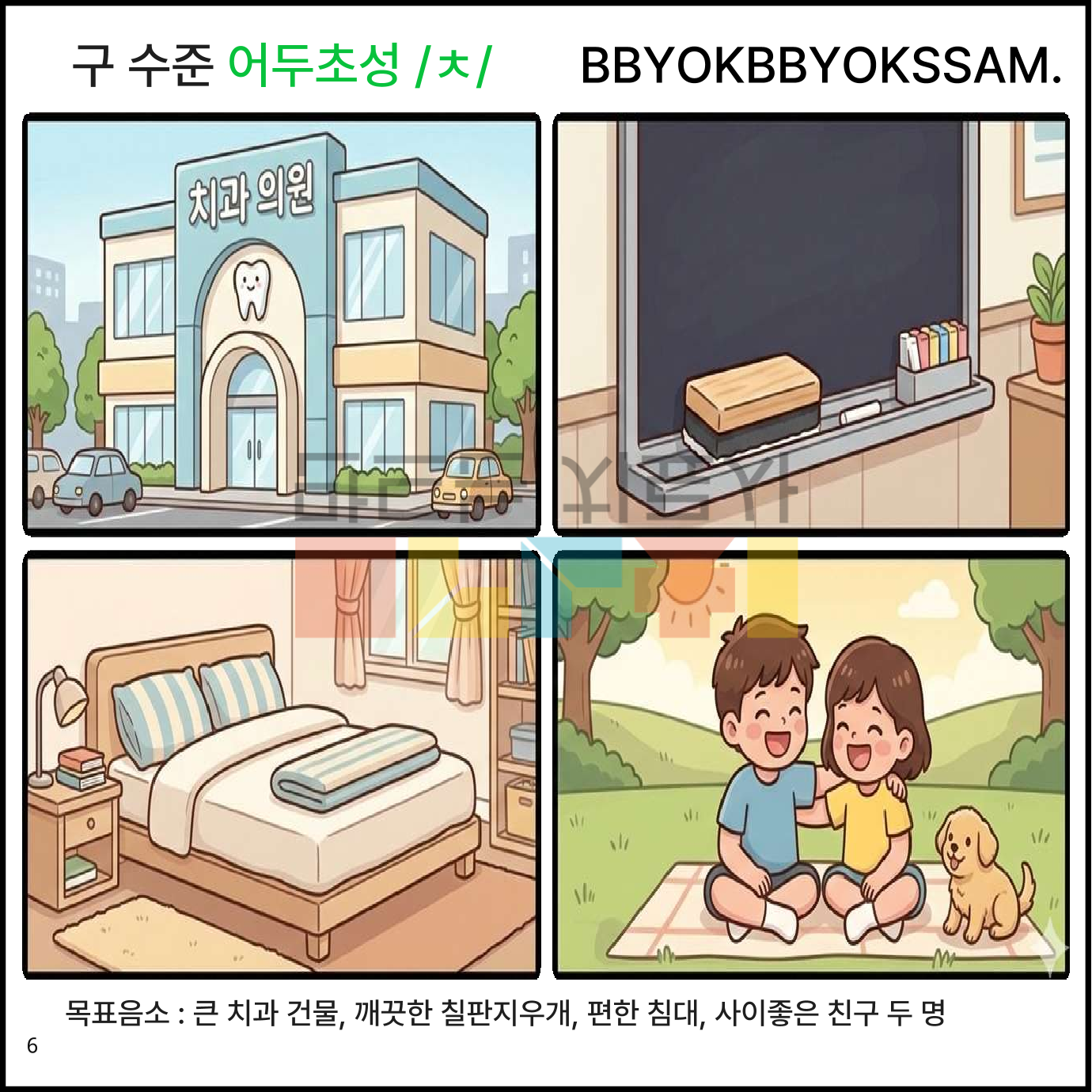 구 수준에서 어두/어중초성 /ㅊ/을 정조음 하는 것으로 구성되어 있습니다. 한 페이지에 4컷으로 구성되어 있으며, 마지막 페이지는 3컷 그림이 있습니다. 어두초성 /ㅊ/은 11페이지(10페이지는 4개의 그림, 11페이지는 3개의 그림), 어중초성 /ㅊ/은 12페이지(11페이지는 4개의 그림, 12페이지는 3개의 그림)으로 구성되어 있습니다.