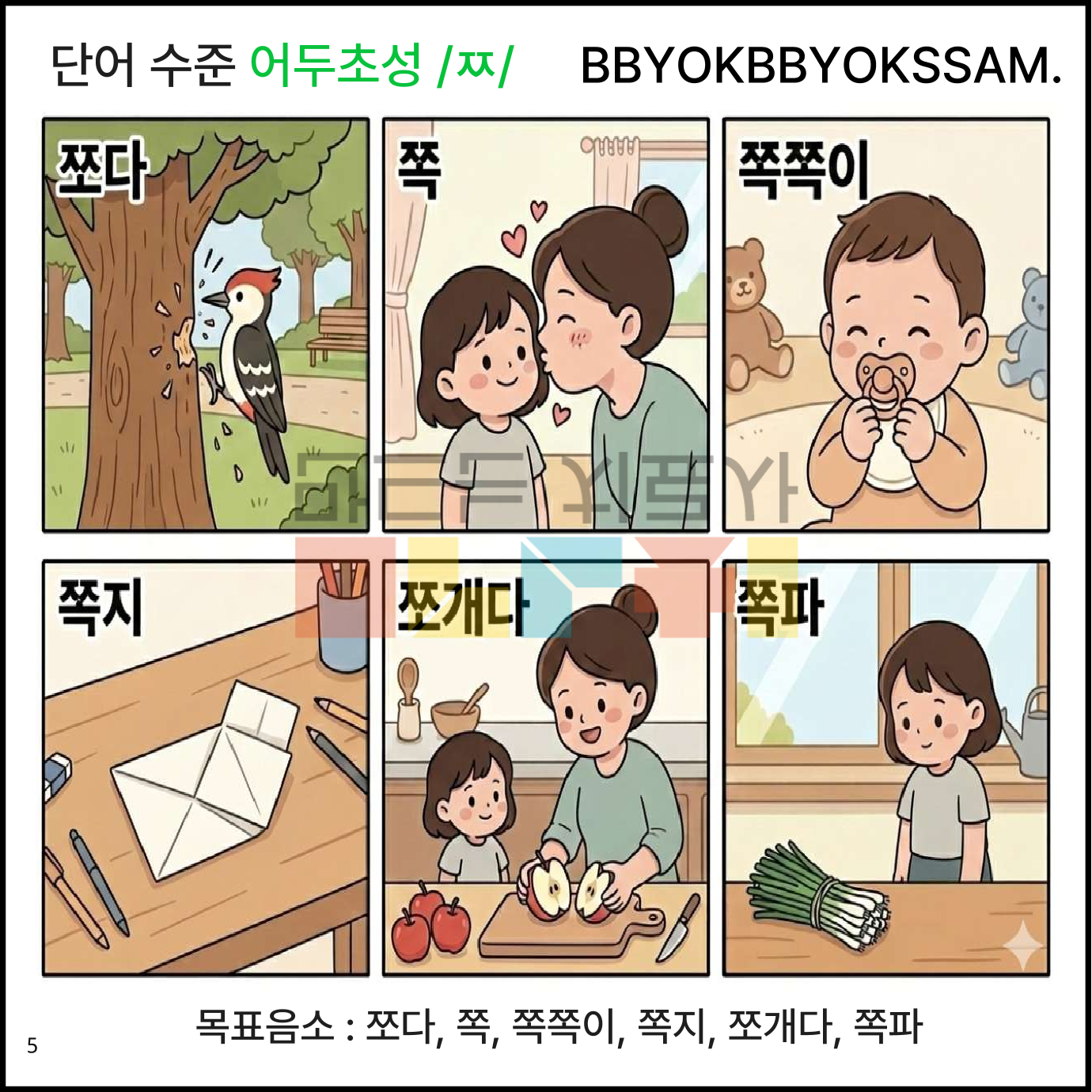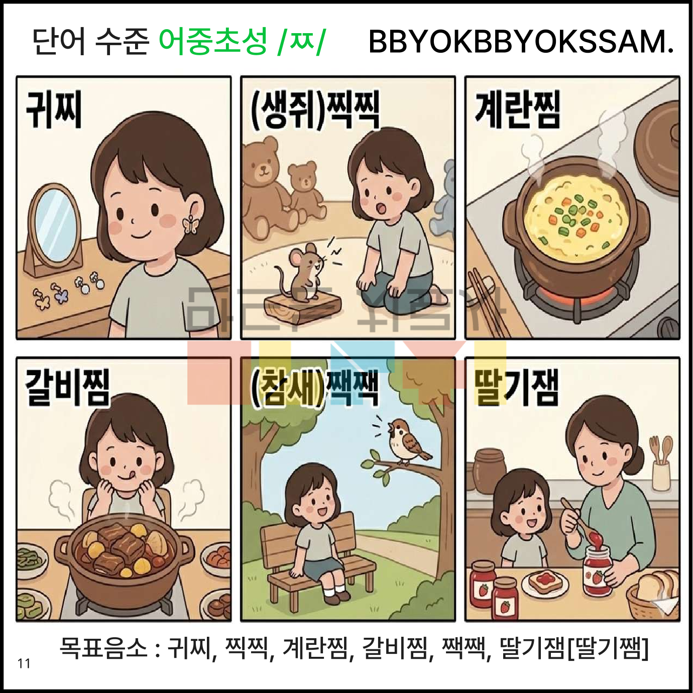 단어 수준에서 어두/어중초성 /ㅉ/을 정조음 하는 것으로 구성되어 있습니다. 한 페이지에 6컷으로 구성되어 있습니다. 어두초성 /ㅉ/은 6페이지, 어중초성 /ㅉ/은 4페이지로 구성되어 있습니다.