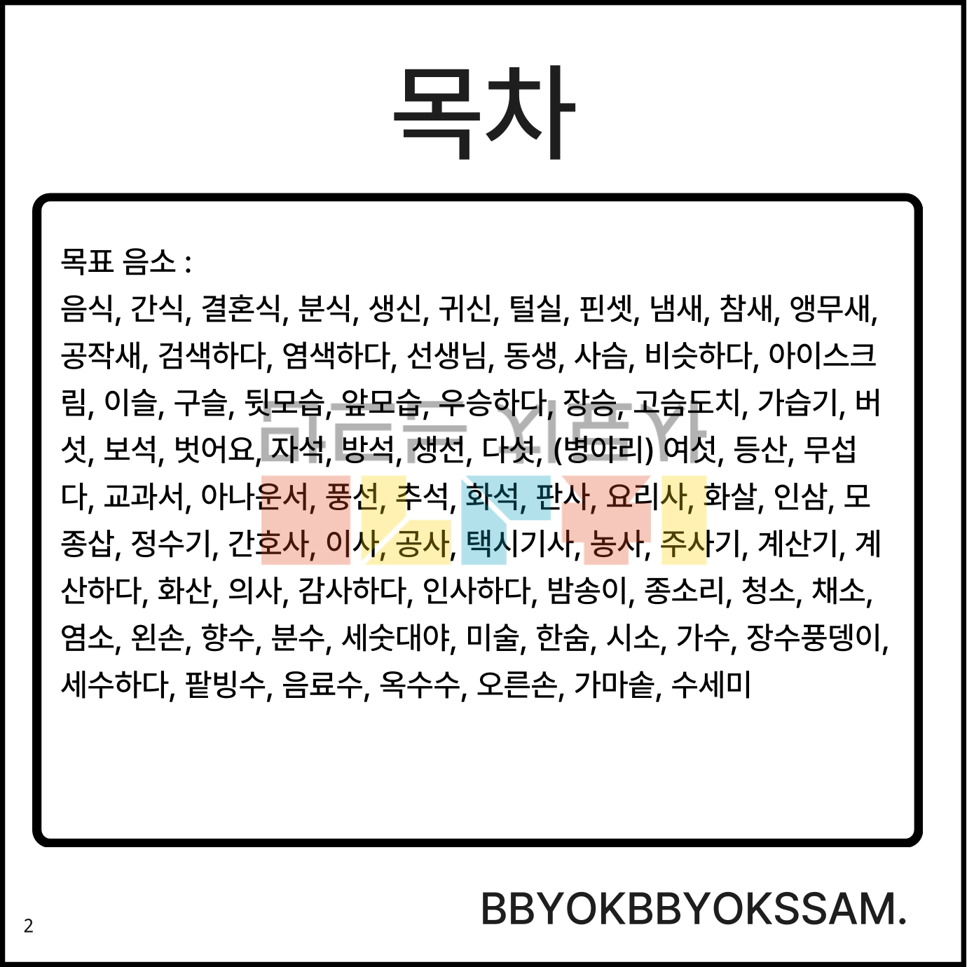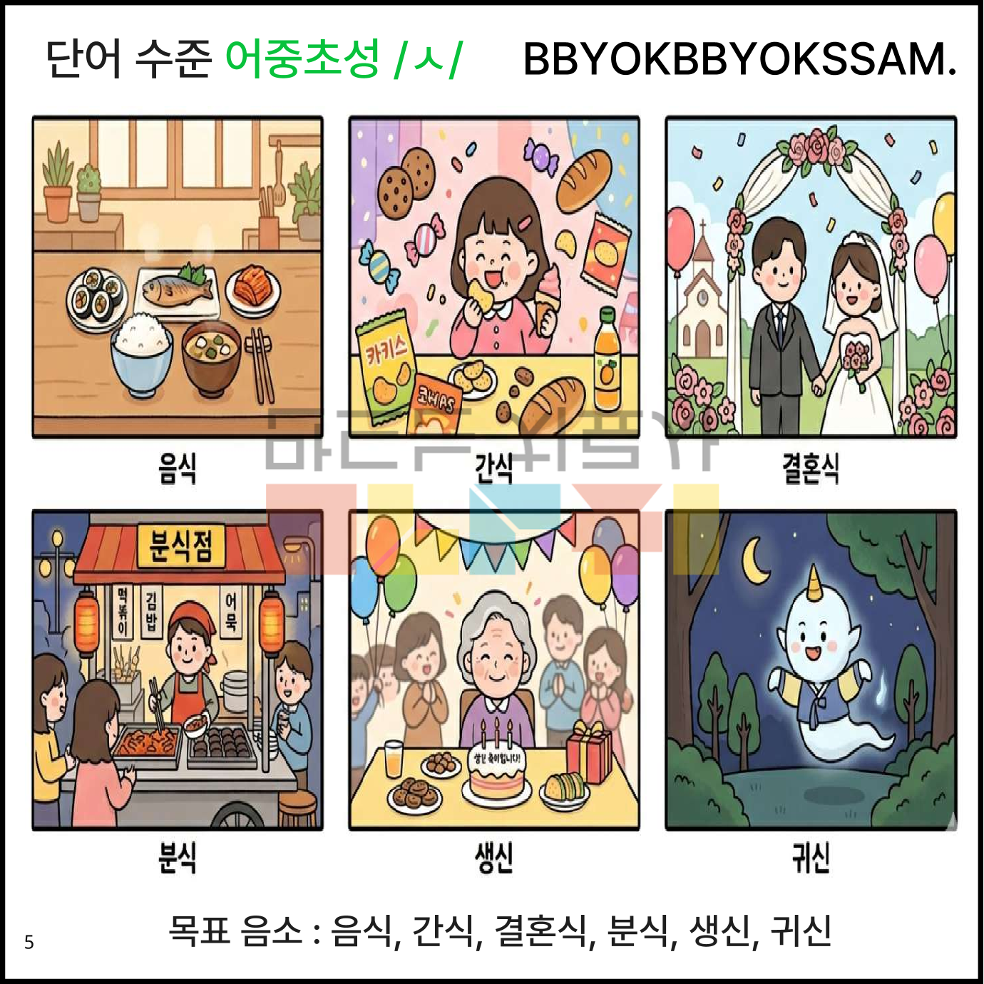 단어 수준에서 어중초성 /ㅅ/을 정조음 하는 것으로 구성되어 있습니다. 한 페이지에 6컷으로 구성되어 있습니다. 어중초성 /ㅅ/은 15페이지(한 페이지 6컷 그림 14페이지, 한 페이지 3컷 그림 1페이지)로 구성되어 있습니다.