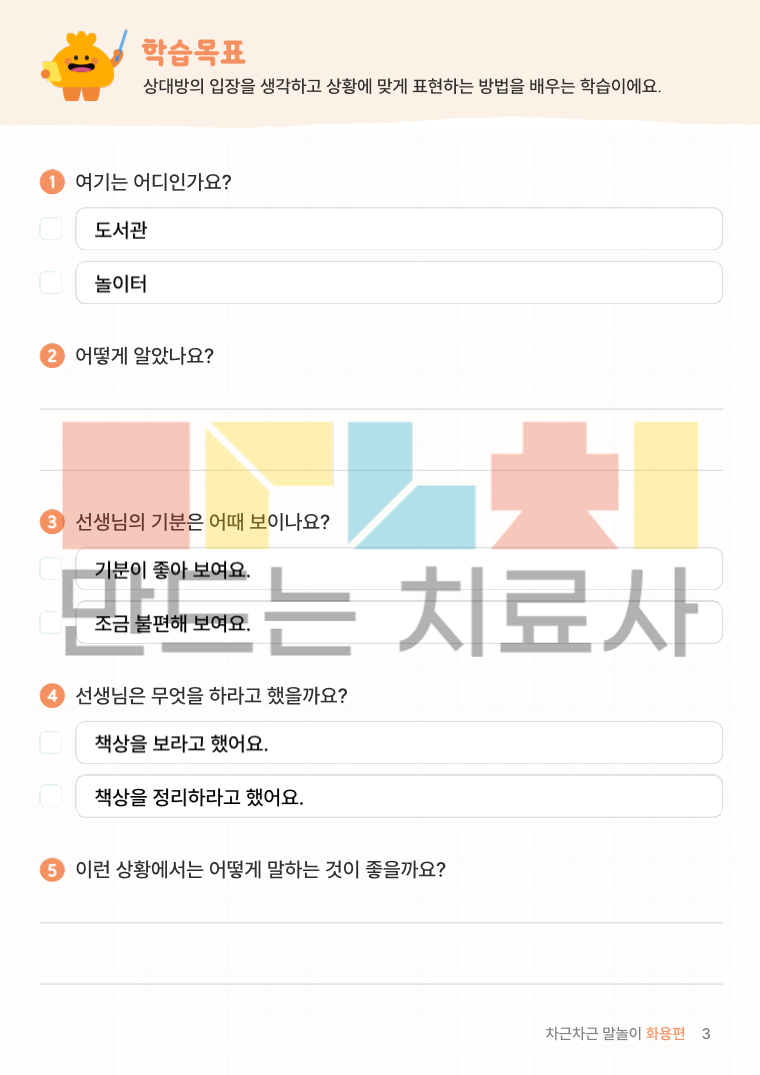 차근차근 말놀이 화용편은 일상에서 일어나는 다양한 상황을 통해 상대방의 마음을 생각하고 상황에 맞게 말하고 행동하는 방법을 차근차근 익히는 화용 언어 학습지입니다.